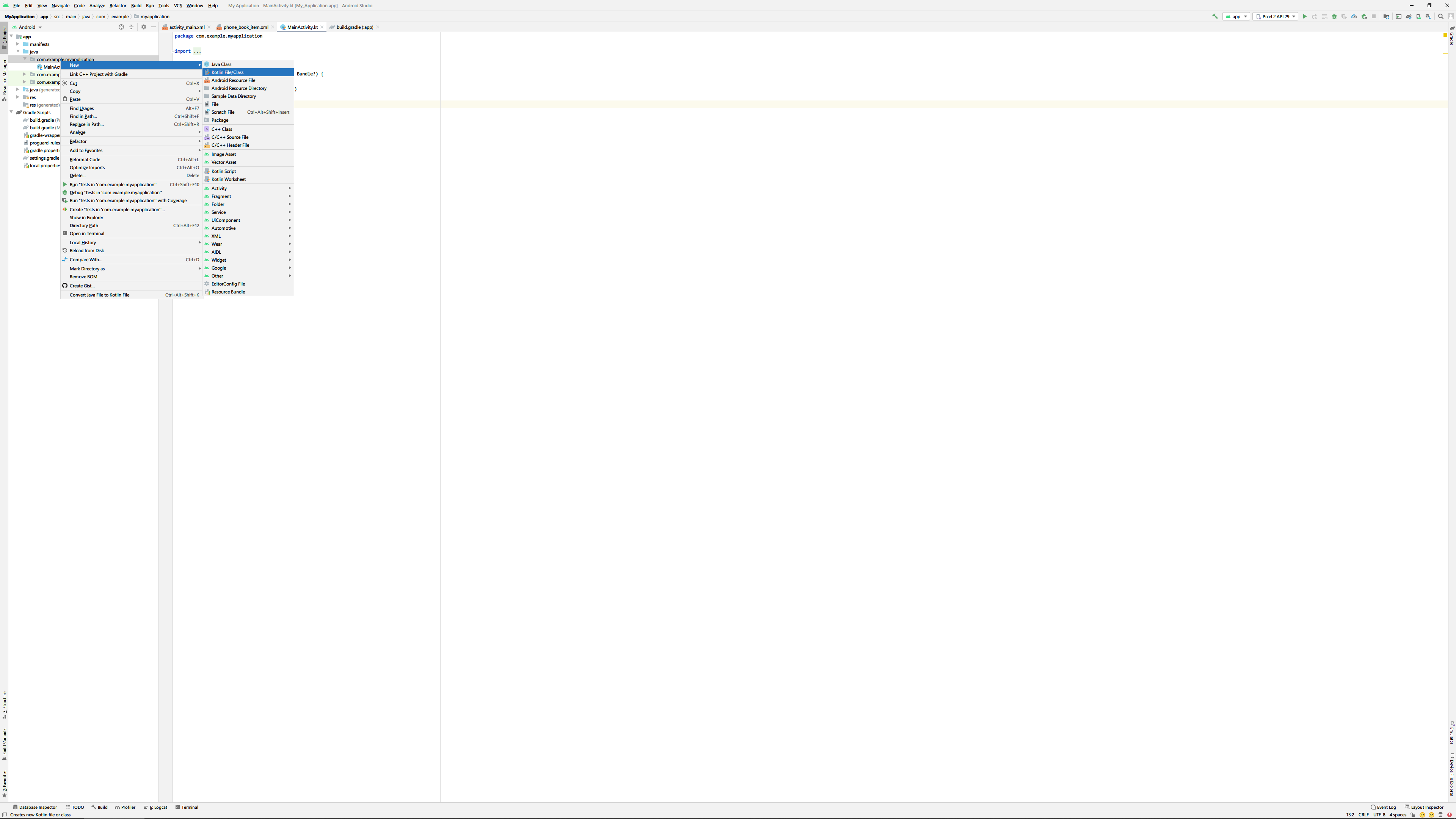 app -> java -> [패키지명]에서 마우스 오른쪽 버튼을 눌러 New -> Kotlin File/Class를 선택합니다.