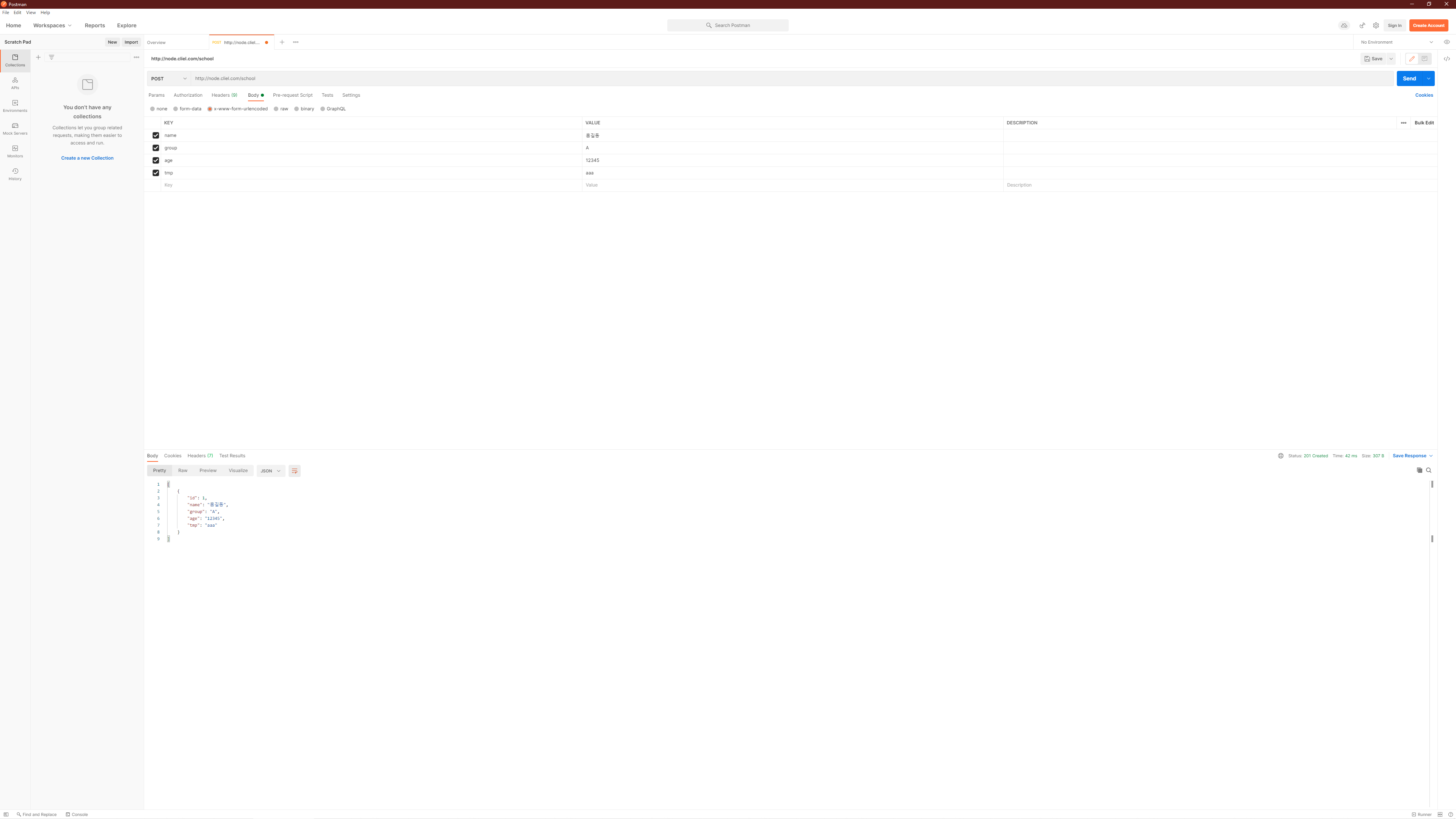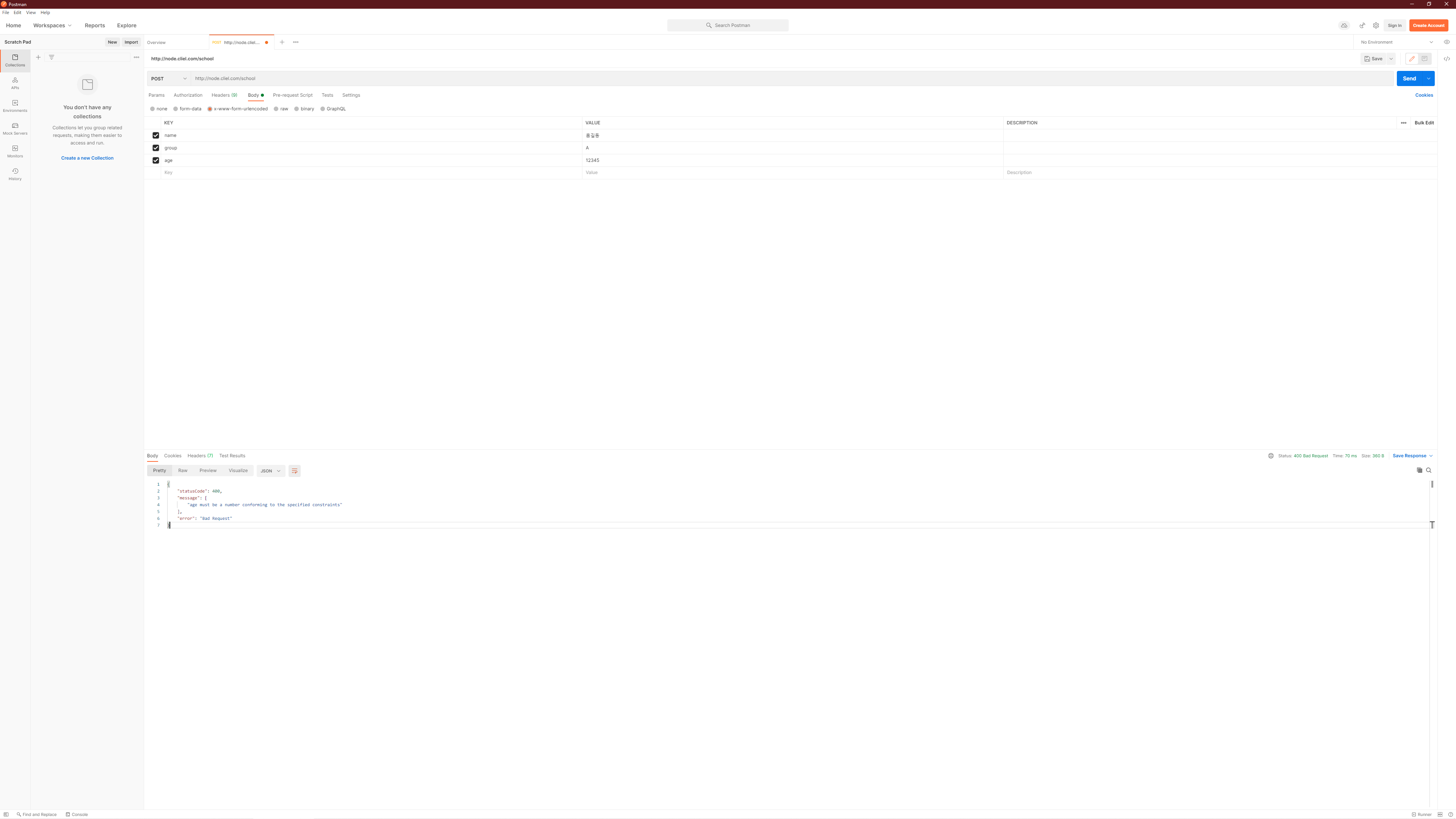 고의적으로 name필드를 누락했으며 age에 숫자가 아닌 문자열을 전달했습니다. 이 상태로 Post를 날려주면 무엇이 잘못되었는지 필요한 정보를 알려주게 됩니다.