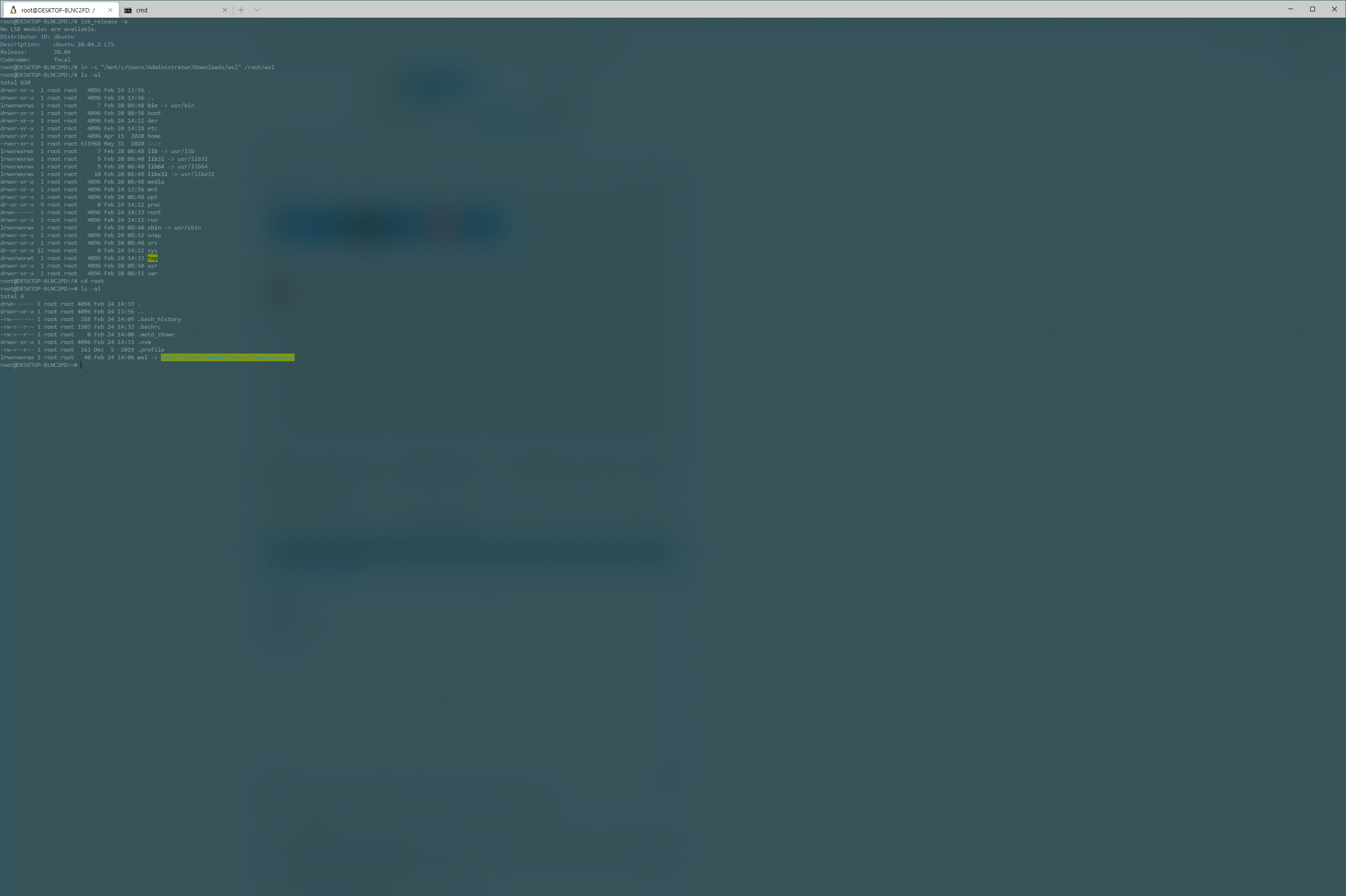 ln -s "/mnt/c/Users/Administrator/Downloads/wsl" /root/wsl