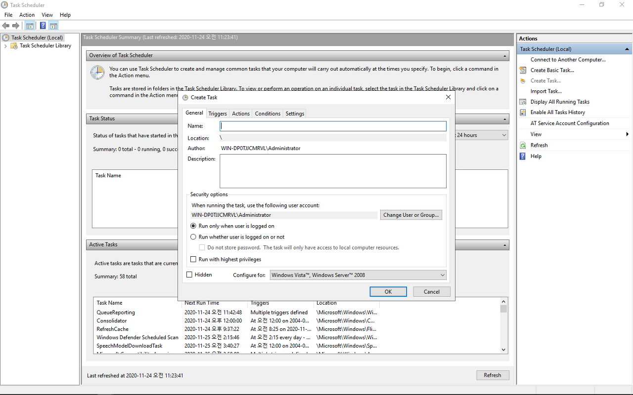 Name에 Ban_REMOTE를 입력하고 아래 Security Options에는 'Run whether user is logged on or not'을 선택합니다. 이때 Name은 해당 Task Scheduler가 어떠한 목적으로 만들어졌는지를 구분할 수 있을 정도면 다른 이름을 지정할 수도 있습니다.