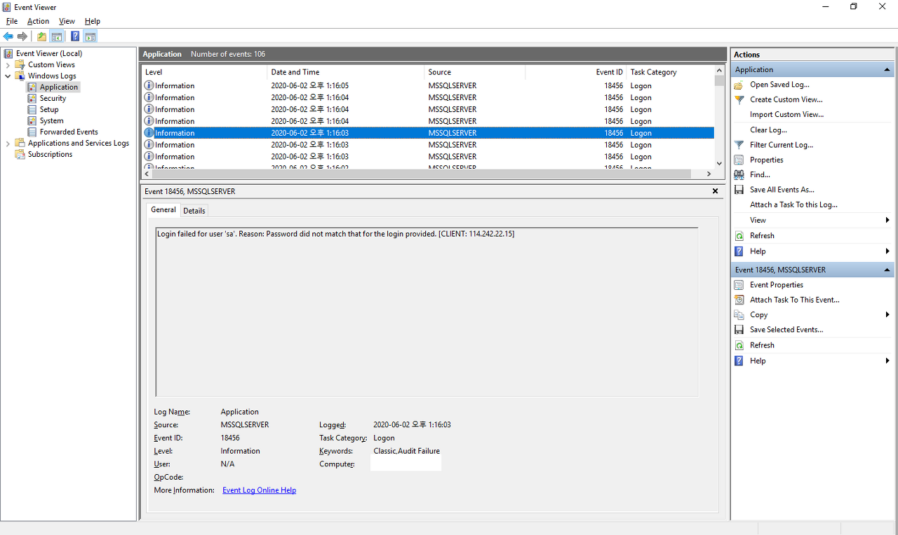이것으로 REMOTE(Ban_Server)에 대한 Task Scheduler을 완료하였습니다. 같은 방법으로 MSSQL에 관한 event로 등록해 줘야 하는데 위의 설정과정 대부분이 동일합니다. 다만 MSSQL의 경우 Trigger에서 Log를 Application을 잡고 Event ID를 18456으로 해야 합니다.