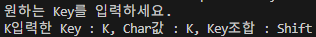 Console.WriteLine($"입력한 Key : {key.Key}, Char값 : {key.KeyChar}, Key조합 : {key.Modifiers}");