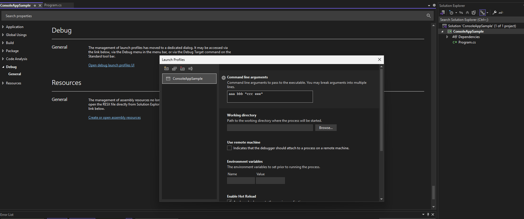 만약 Console App을 VS2022에서 생성하고 실행하고자 한다면 Solution Explorer에서 Project의 속성으로 들어가 Debug에서 'Open debug launch profiles UI'를 눌러 'Command Line arguments'부분에 아래와 같이 전달할 인수를 입력하면 됩니다.