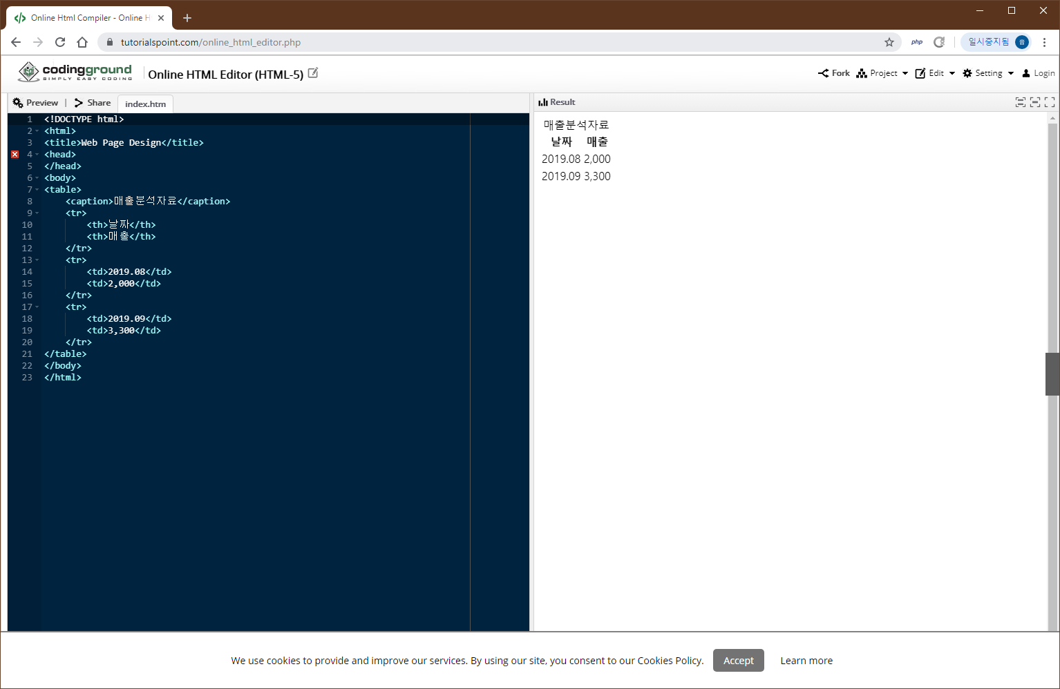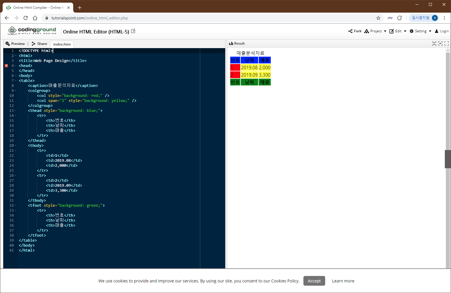 그외 <tbody>는 테이블의 몸체를 <tfoot>는 테이블의 밑글을 의미합니다.