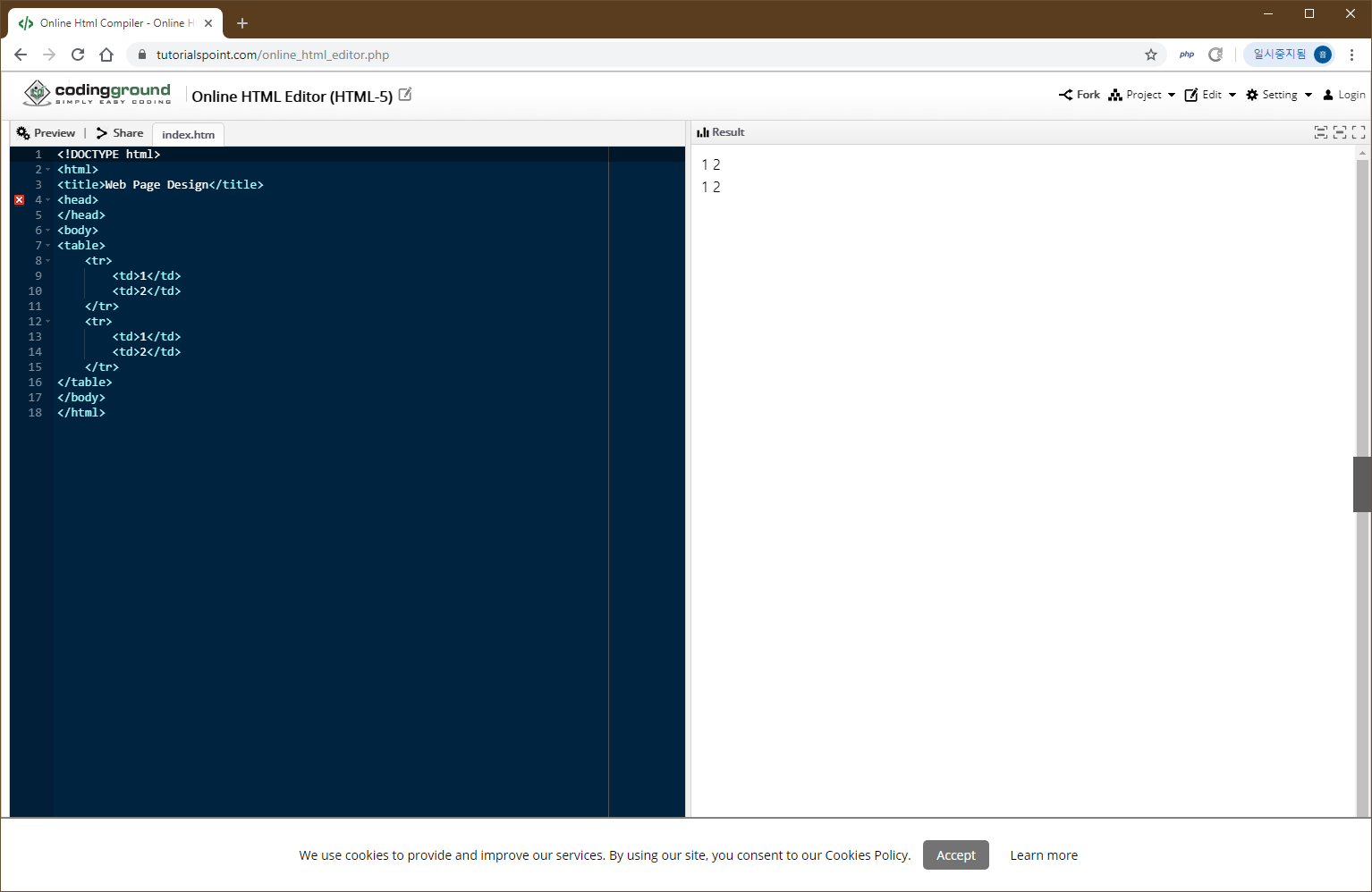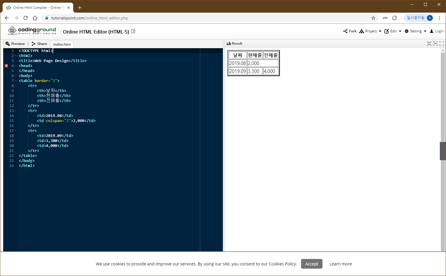 만약 셀에 같은 내용이 있고, 이들 셀을 병합해야 한다면 colspan을 사용하여 원하는 셀만큼 병합할 수 있습니다.
