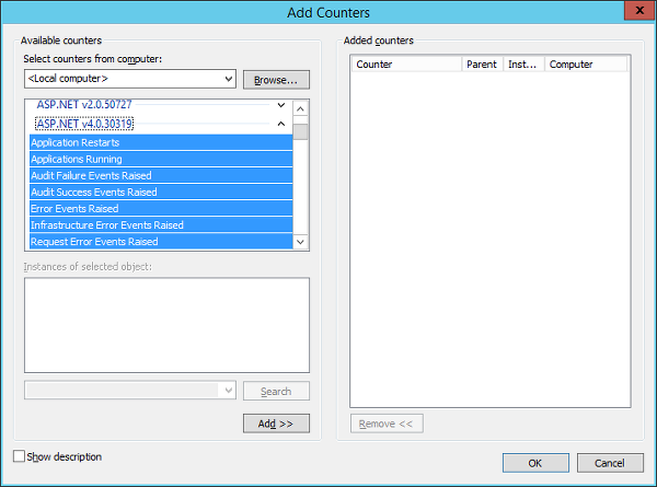 서버에 ASP.NET등으로 웹 프로그램을 운용한다면 다음과 같이 ASP.NET에 적용되는 성능카운터등을 확인할 수 있습니다.
