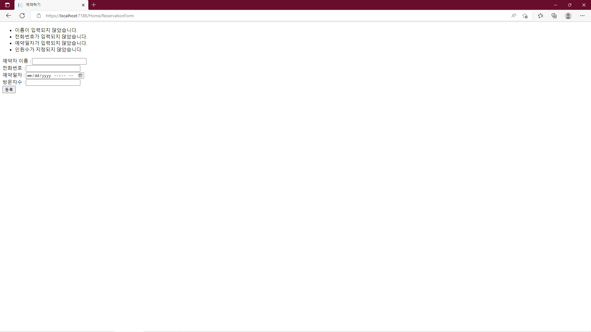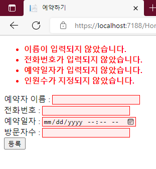 예약하기에서는 사용자가 필요한 모든 Form을 입력하지 않거나 아예 빈 화면상태에서 '등록'버튼을 눌러버릴 수도 있습니다. ASP.NET Core Application에서 유효성 검증 규칙은 Model 클래스에 Attribute를 정의함으로써 적용될 수 있는데 이 것은 해당 Model 클래스를 사용하는 모든 Form에 동일한 유효성 검증 규칙을 적용할 수 있다는 것을 의미합니다.