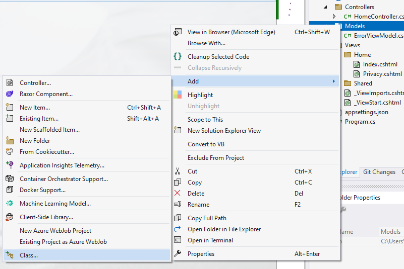 Visual Studio의 Solution Explorer에서 Models폴더에 마우스 오른쪽 버튼을 눌러 Add -> Class항목을 선택해