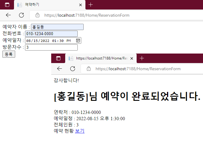 참고로 이전에 존재하던 ReservationForm() 메서드에는 [HttpGet]이라는 Attribute를 추가하여 해당 Method는 오로지 GET 요청에만 사용될 수 있도록 정의하였습니다. 그다음 같은 이름의 ReservationForm() 메서드를 하나 더 만들었는데 매개변수로 ReservationResponse의 객체를 전달받는 메서드이며 [HttpPost] Attribute를 적용함으로써 이 메서드는 POST 요청에만 사용될 수 있음을 정의하고 있습니다.