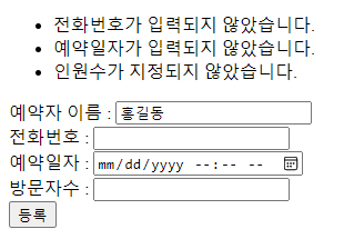 위의 뷰까지 생성되었으면 프로젝트를 실행하여 '예약하기'링크를 누른 뒤 필요한 Form을 작성하고 '등록'버튼을 눌러 실행결과를 확인합니다.