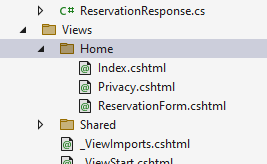 보시면 Index()와 ReservationForm()둘다 매개변수 없이 View() 메서드를 호출하고 있는데 Razor 뷰 엔진은 View파일을 찾는데 Action Method이름을 사용합니다. 즉, ReservationForm() 메서드는 Razor에게 ReservationForm.cshtml이라는 파일을 View에서 찾아보라고 하는 것입니다.