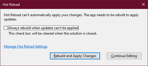 클래스를 추가하고 저장하게 되면 아마도 Hot Reload가 적용될 수 없다는 메시지를 보게 될지도 모릅니다. 이는 Visual Studio안에서 새로운 클래스 파일을 추가하고 정의하는 등의 모든 변경사항에 대해 Hot Reload가 대처할 수 없다는 것입니다. 깊게 생각할 필요 없이