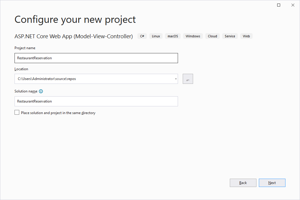 ASP.NET Core MVC 템플릿을 통해 'RestaurantReservation'이라는 새로운 프로젝트를 생성합니다.