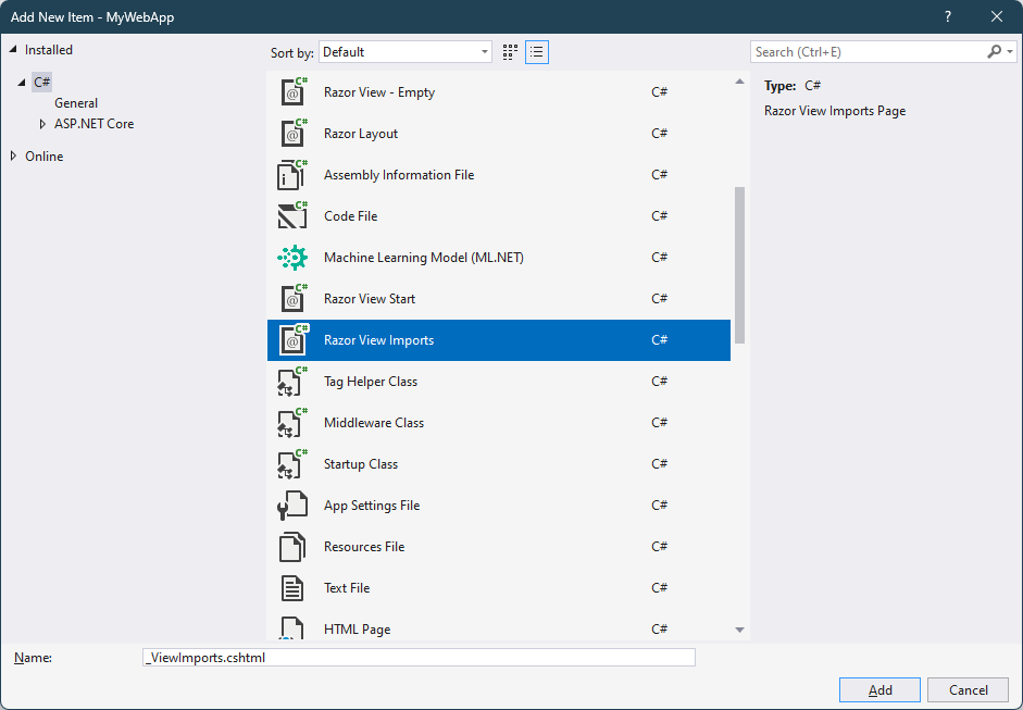 Razor Page는 또한 Partial View를 사용할 수 있으므로 공통된 content를 중복시킬 필요가 없습니다. 이번 예제는 Tag helper기능에 의존하므로 아래와 같이 View import file에 이와 관련된 지시자를 추가하여 사용자 정의 HTML요소를 Partial View에 적용할 수 있도록 합니다.