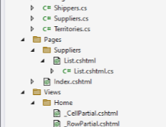 Razor Page는 Routing을 위해 cshtml file의 위치에 의존합니다. 따라서 /index URL로의 요청은 /Pages/Index.cshtml file을 처리하게 되는 것입니다. 만일 Application에서 필요한 URL구조가 있다면 지원하고자 하는 URL segment의 이름으로 folder를 추가해주면 됩니다. 예를 들어 /Pages/Suppliers라는 folder를 만들고 여기에 List.cshtml file을 아래와 같이 추가해 봅니다.
