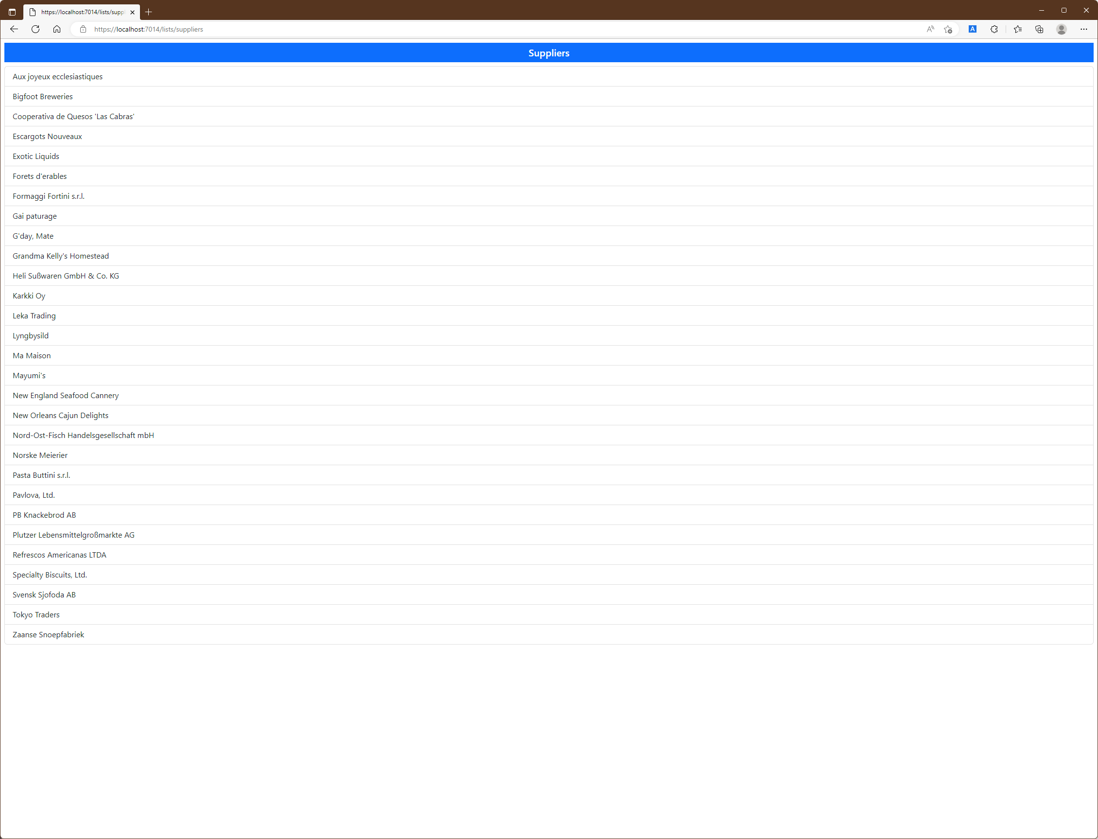 Page model class는 Suppliers속성을 정의하고 있는데 이 속성은 Database에 있는 Supplier개체에 대한 일련의 CompanyName값을 설정합니다. 또한 예제에서 Database와의 상호작용은 동기화이므로 Page model class는 OnGetAsync가 아닌 OnGet Method를 정의하고 있습니다. Project를 실행하고 /suppliers/list로 URL을 요청하여 다음과 같은 응답이 생성되는지 확인합니다. 요청한 URL segment의 경로는 folder와 List.cshtml Razor Page file명에 해당합니다.