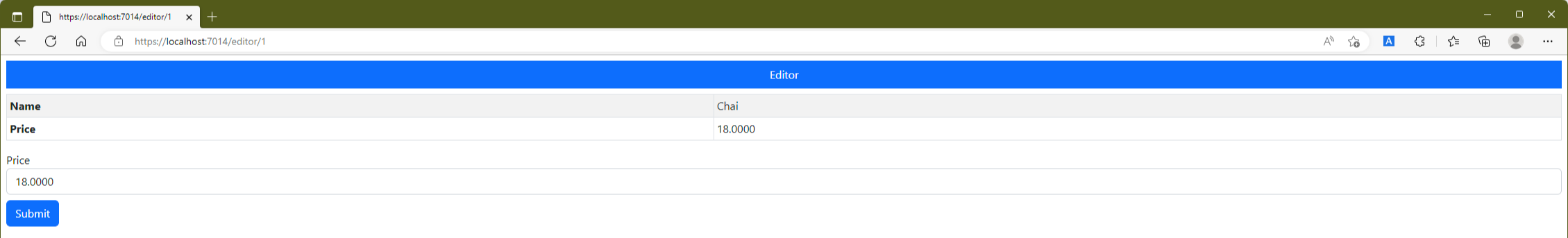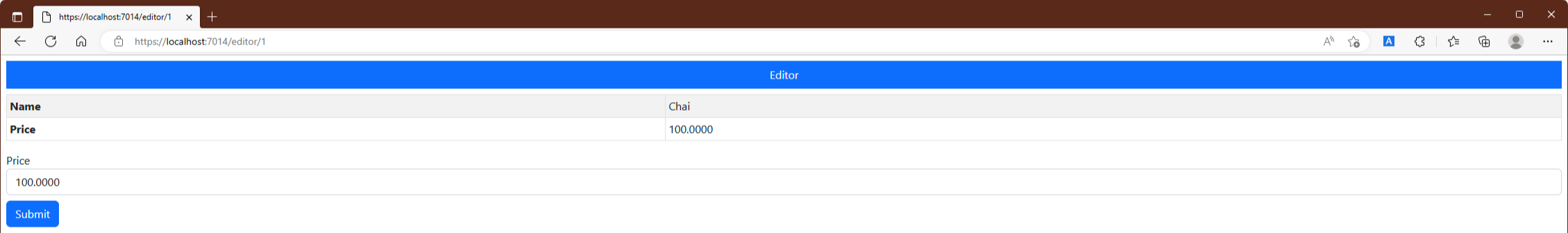 Project를 실행하여 /editor/1으로 URL을 요청합니다. 그리고 Input Field의 값을 100으로 변경한 뒤 Submit button을 눌러줍니다. 그러면 Browser는 POST 요청을 OnPostAsync Method로 잔달하여 Database를 변경하고 다시 Browser는 Redirect를 수행함으로써 변경된 값을 표시하게 됩니다.