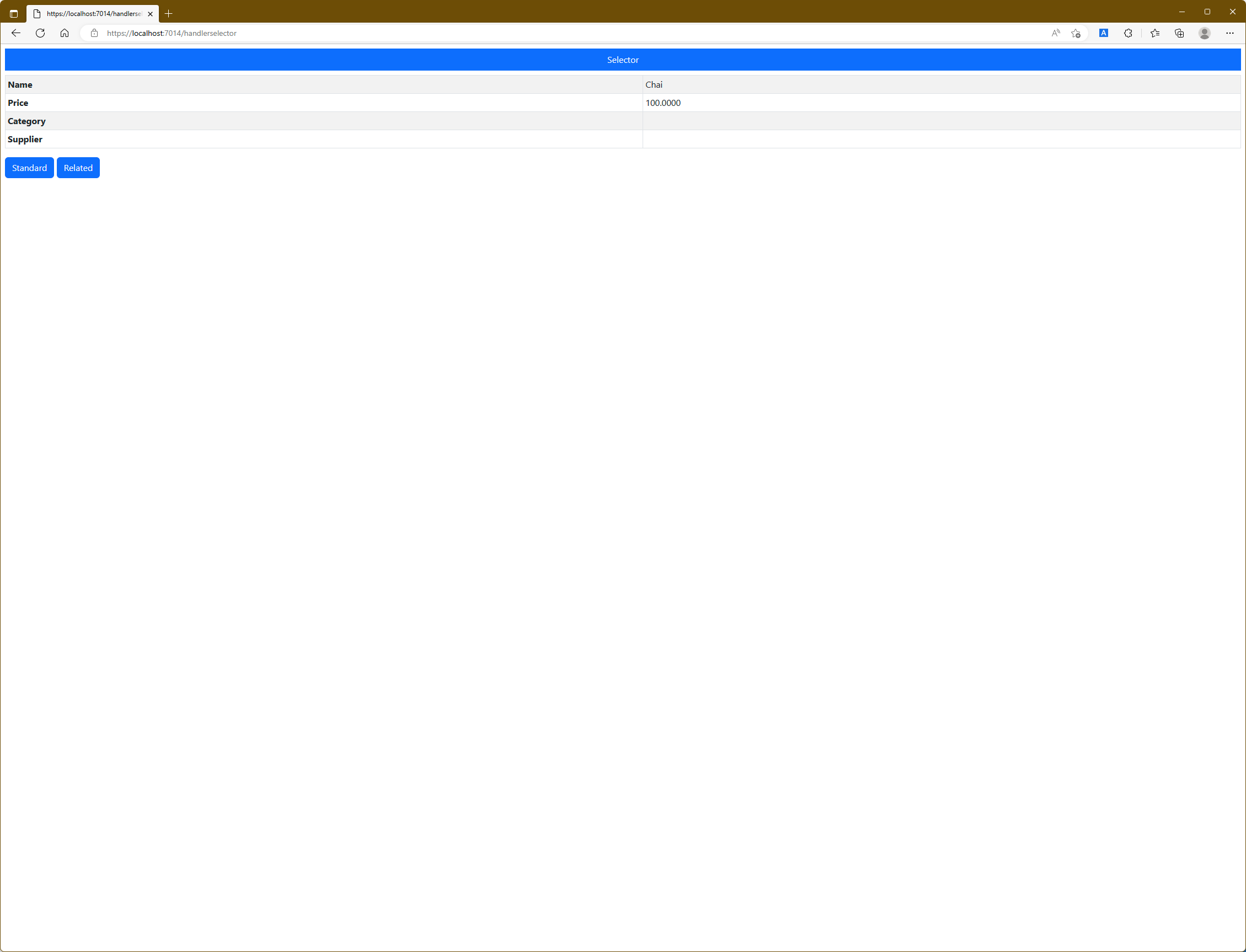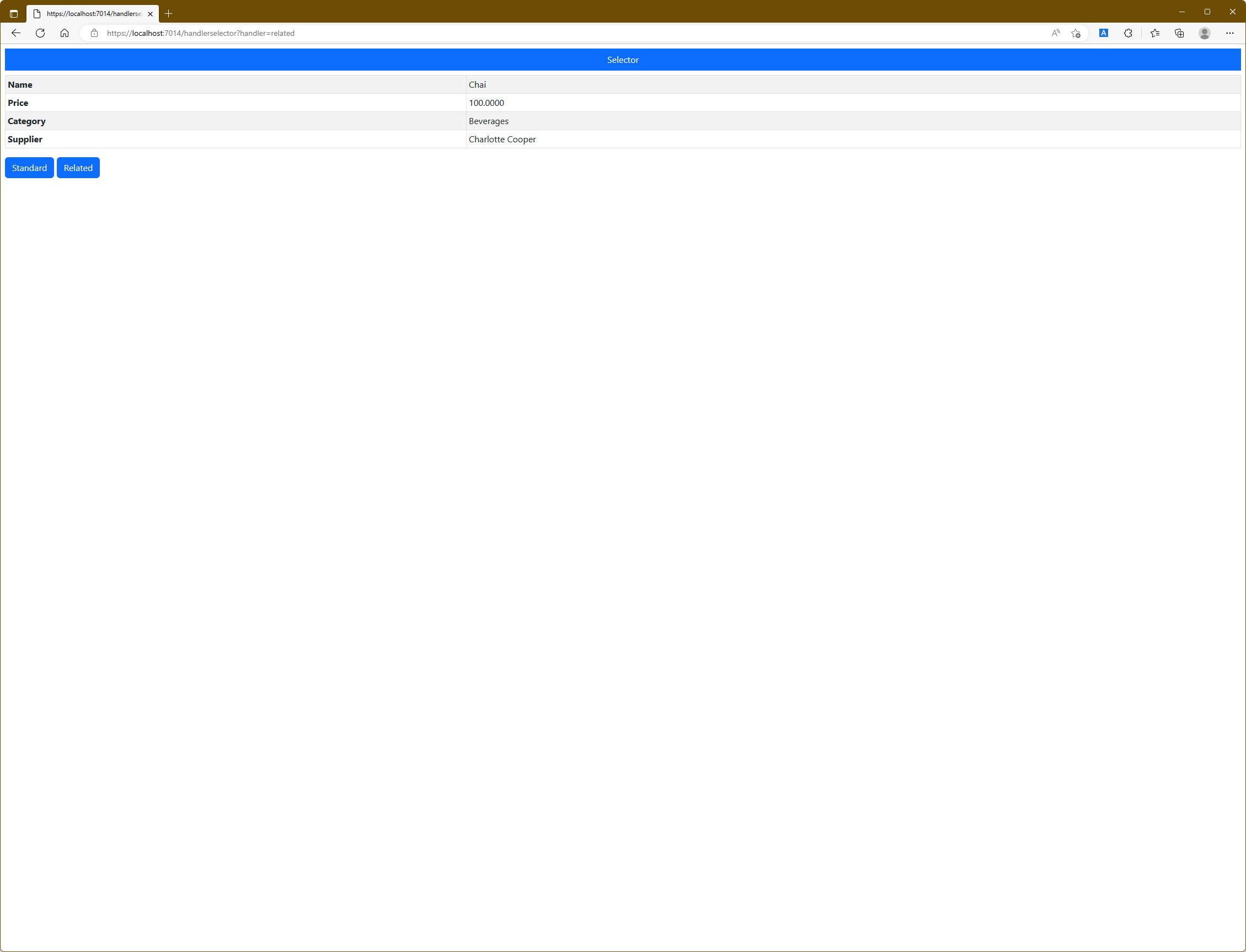 예제에서 Page Model class는 OnGetAsync와 OnGetRelatedAsync라는 2개의 처리 Method를 정의하고 있습니다. OnGetAsync Method를 기본적으로 사용되는 Method로서 Project를 실행하고 /handlerselector URL을 요청하여 사용할 수 있습니다. 해당 Method는 Database로 질의하여 그 결과를 사용자에게 아래와 같이 표시할 것입니다.