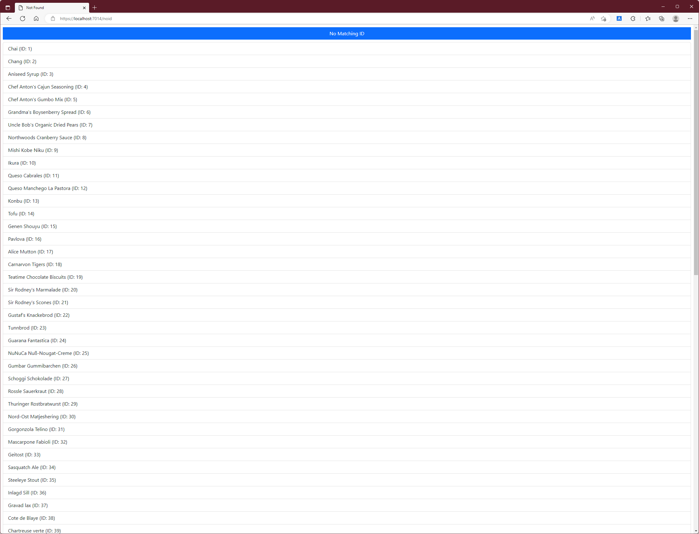 예제에서 query 문자열은 id라는 이름의 매개변수를 전달하고 있으며 해당 값은 Index Razor Page의 OnGetAsync Method에 정의된 id 매개변수로 model binding process에 의해 전달됩니다. model binding에 관해서는 추후에 설명하겠지만 지금은 요청 URL에 있는 query string매개변수가 OnGetAsync가 호출될 때 id인수로 전달되고 Product에 대한 Database질의에 사용된다는 것만 기억하면 충분합니다.