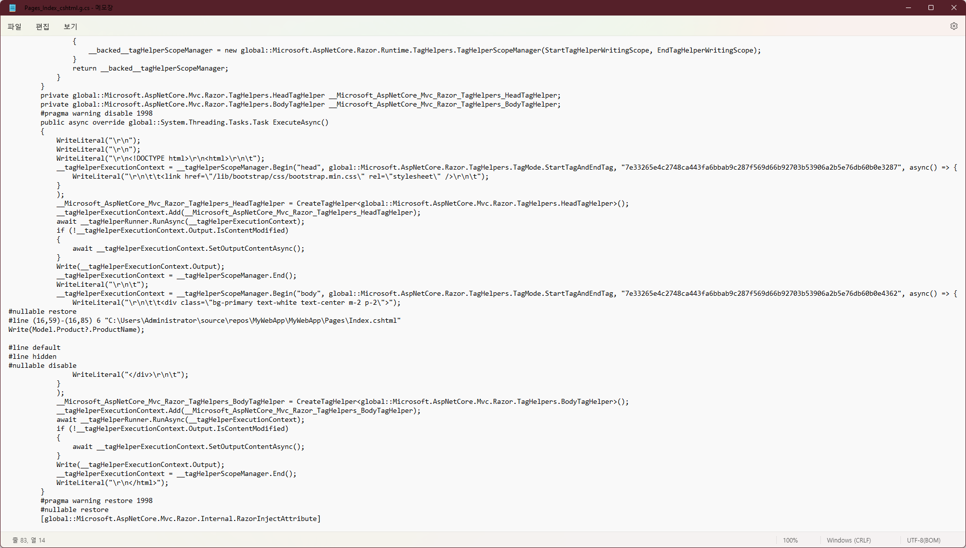 이면에서 Razor Page는 일반적인 Razor View처럼 C# class로 변환됩니다. 아래 예제는 Razor Page에서 C# class로 변환된 일부를 나타낸 것입니다.