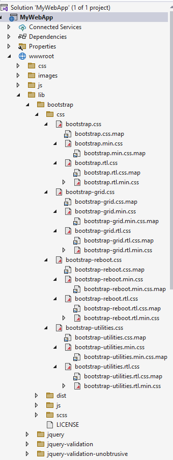 LinkTagHelper는 CSS file을 제외하거나 선택하기 위한 globbing patterns 등을 포함 많은 기능을 ScriptTagHelper와 공유하고 있습니다. 따라서 이 둘을 개별적으로 취급할 필요는 없습니다. 정확하게 CSS file을 선택하는 것은 javascript file만큼이나 중요한데 stylesheet는 또한 일반 version과 최소화 version이 있을 수 있으며 source map file 또한 지원할 수 있기 때문입니다. HTML요소의 style을 위해 예제에서 사용해온 보통의 Bootstrap package는 wwwroot/lib/bootstrap/ css folder에서 stylesheet file을 포함하고 있으며 visual studio의 solution explorer에서 다음과 같이 확인할 수 있습니다.