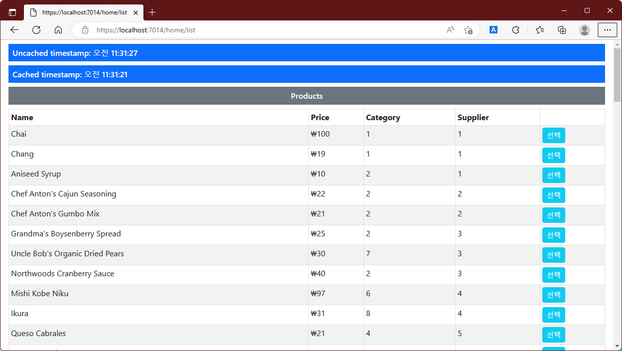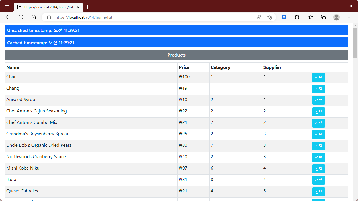 express-sliding attribute의 효과를 확인해 보려면 project를 실행하고 /home/list로 URL을 요청합니다. 만약 10초 안에 browser를 새로고침한다면 cache 된 content가 사용될 것이며 10초가 지난 이후에 새로고침을 시도한다면 cache된 content는 만료되고 view component는 새로운 content를 생성한뒤 만료설정이 새롭게 적용될 것입니다.