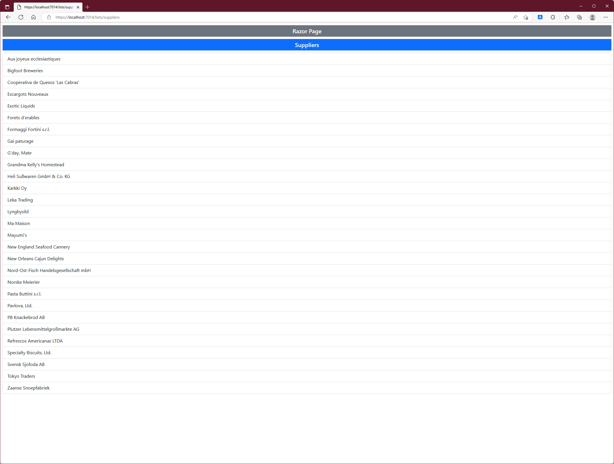 예제는 div와 함께 /suppliers/list razor page를 목표로 하는 URL을 생성합니다. controller나 page model class에서도 아래와 같이 같은 interface를 사용할 수 있습니다.