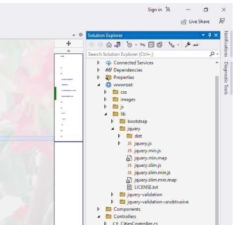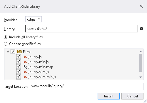 앞으로 보게될 예제 중 일부는 jquery package인 javascript file을 사용하기 위한 tag helper를 포함하고 있습니다. 따라서 Visual Studio의 Add->Client-Side Library기능을 통해 jquery package를 설치합니다.