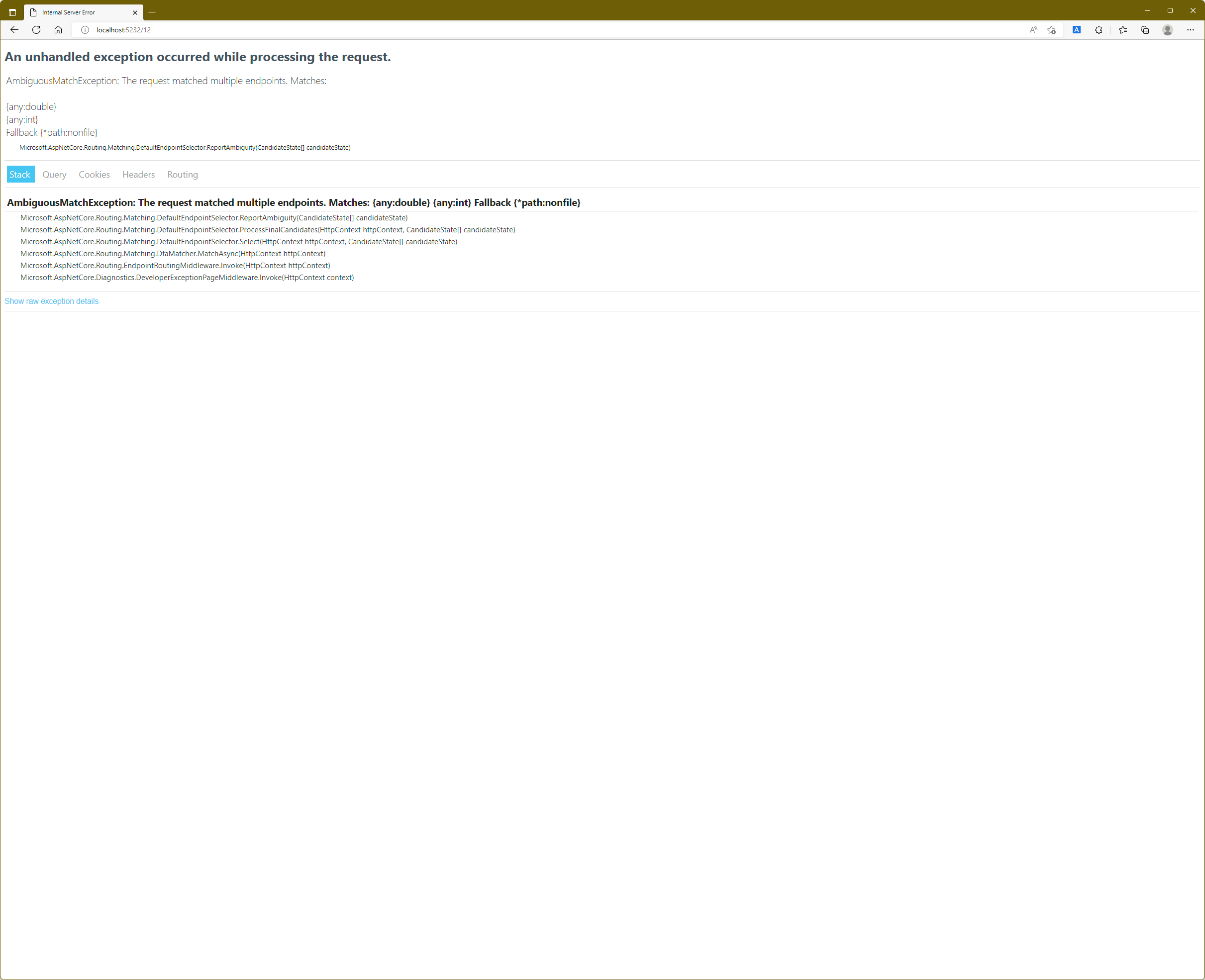 즉 12라는 값은 int로도 double로도 처리될 수 있기 때문에 routing system이 요청을 처리하기 위한 routing을 식별하지 못한 것입니다.