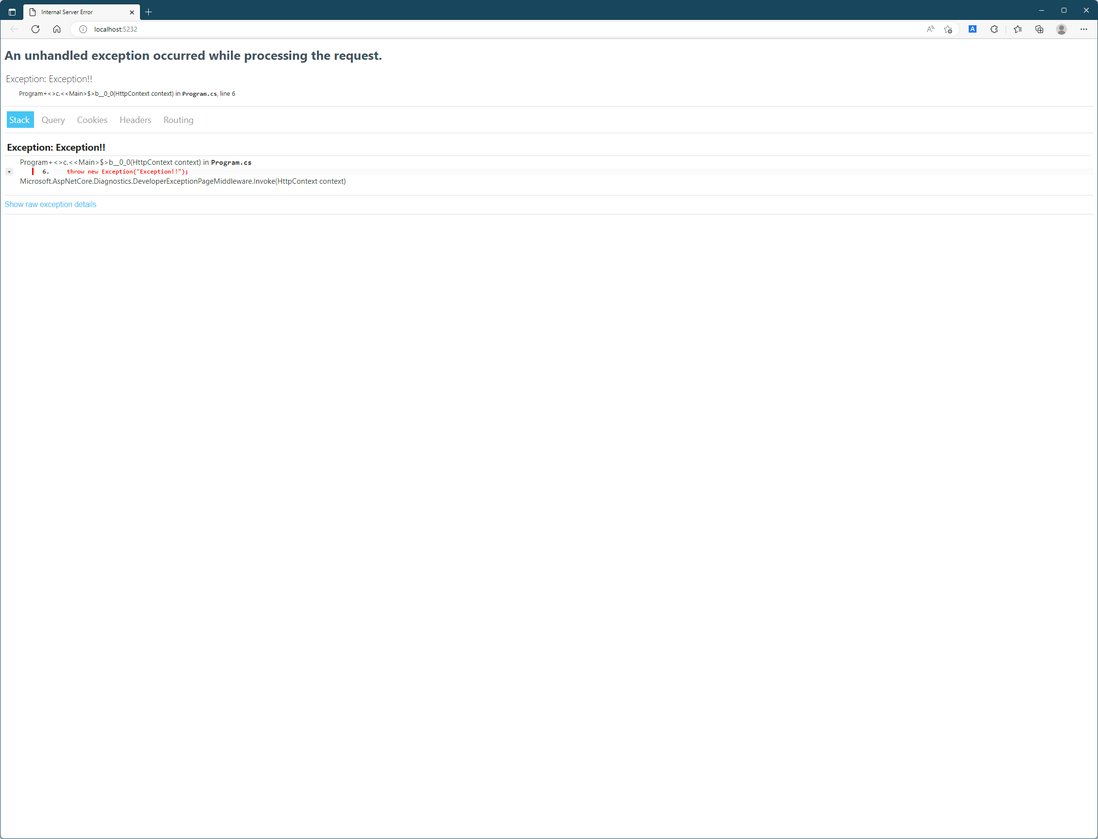 위 code에서 UseDeveloperExceptionPage Method는 예외를 가로채 더욱 도움이 될 수 있는 상세한 응답을 표현하는 Middleware component를 추가합니다. 예외가 처리되는 방식을 알아보기 위해 이전 이전 예제에서 사용된 middleware와 endpoint를 고의적으로 예외를 발생시키는 새로운 component로 아래와 같이 대체하였습니다.