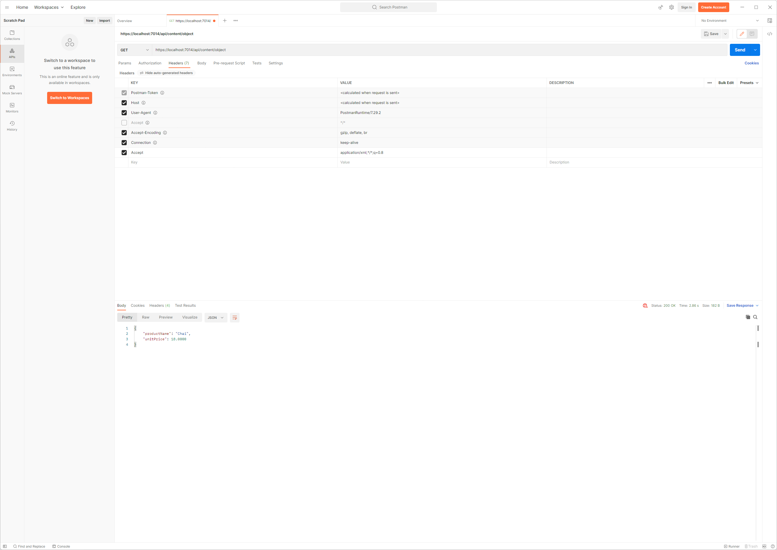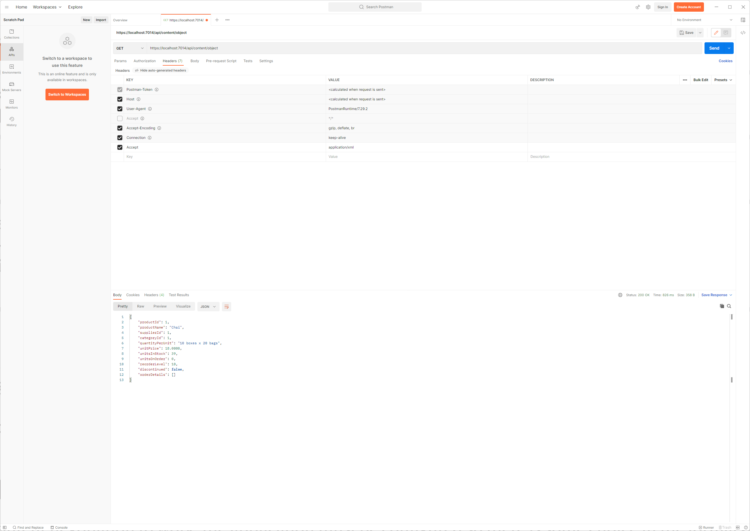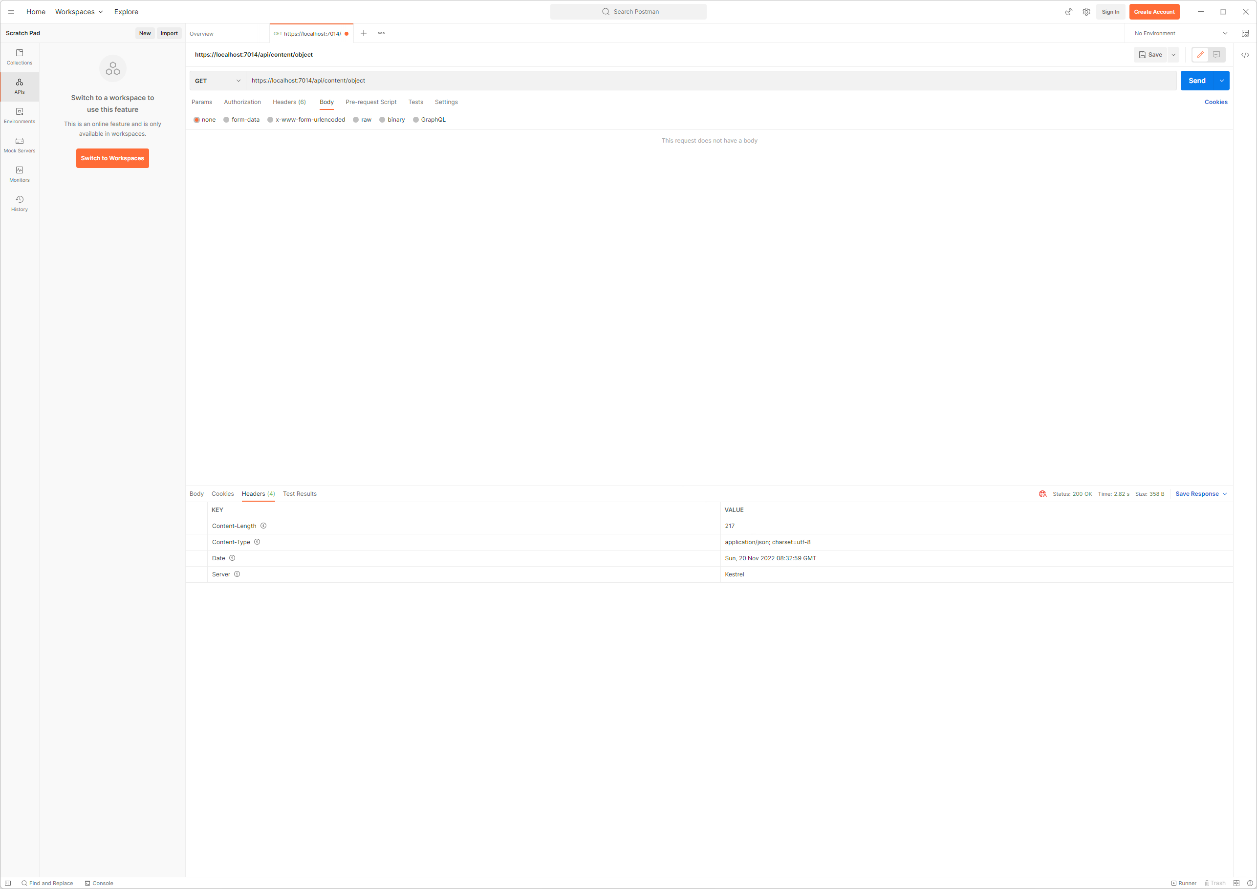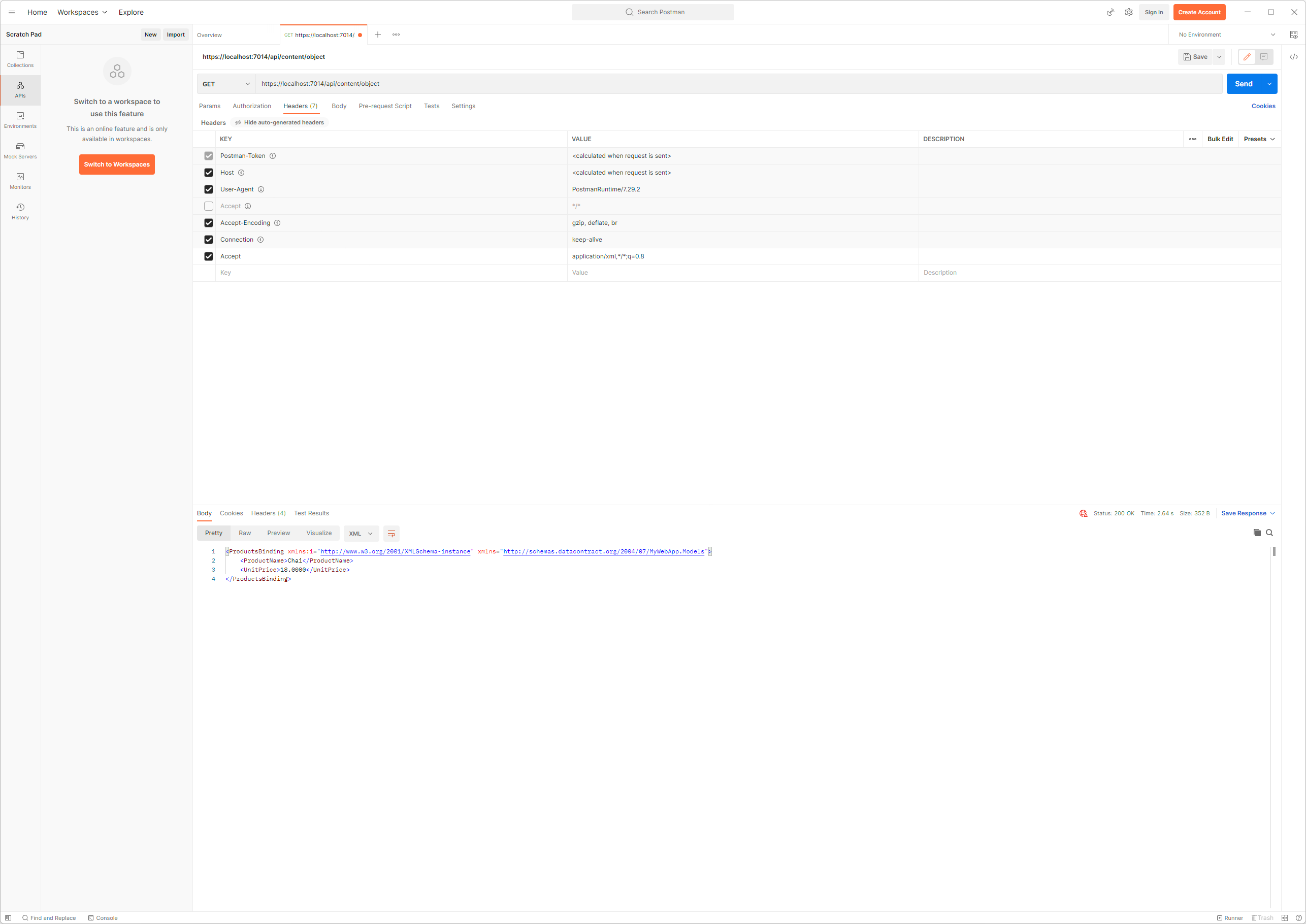 하나이상의 유형을 지정할 수 있는 attribute의 매개변수는 action으로부터 응답에 사용될 수 있는 형식을 특정할 수 있는데 예제에서 Produces attribute는 MVC Framework가 Accept header를 처리할 때 고려할 수 있는 유형을 제한하고 있습니다. Produces attribute의 적용 효과를 확인해 보기 위해 POSTMAN에서 Accept header를 'application/ xml,application/json;q=0.8'로 지정하고 /api/content/object URL을 요청합니다.