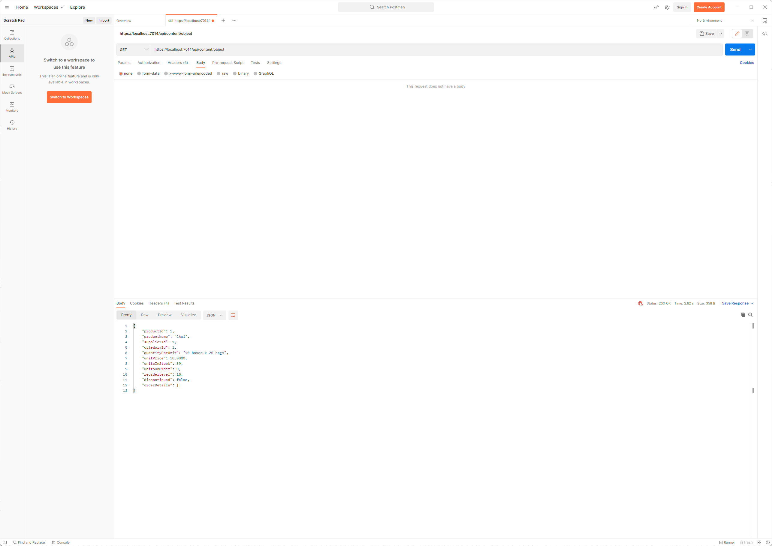 XML Serializer에는 몇 가지 제한이 있는데 이 중에서 Entity Framework Core탐색 속성은 interface를 통해 정의되었기 때문에 이를 통한 처리가 불가능하다는 점도 포함됩니다. 예제는 serialize 가능한 개체를 생성하기 위해 ContentController.cs에서 GetObject method를 아래와 같이 변경하였습니다. 이때 이전에 project에 정의했던 ProductBinding을 재사용하였습니다.