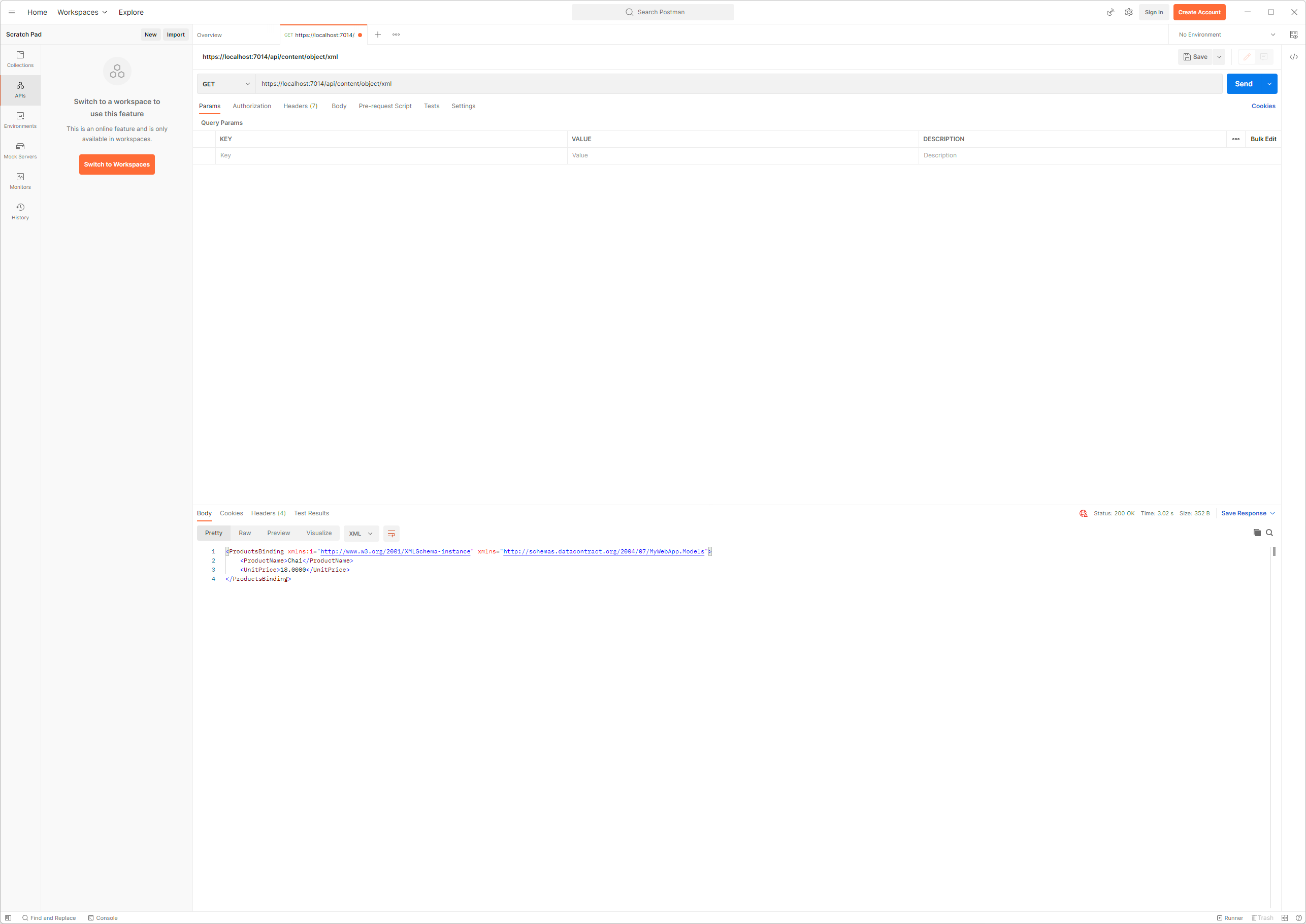 Application에서 지원하는 각 Data형식은 XML을 위한 xml과 JSON을 위한 json이라는 약어를 가지고 있습니다. 따라서 action method가 이들 약어 중 하나를 포함하는 URL을 통해 지정될 때 Accept header는 무시되고 지정된 형식이 사용될 것입니다. attribute의 적용 결과를 확인해 보기 위해 project를 실행하고 POSTMAN에서 /api/content/object/xml과 /api/content/object/json을 차례로 요청해 봅니다.