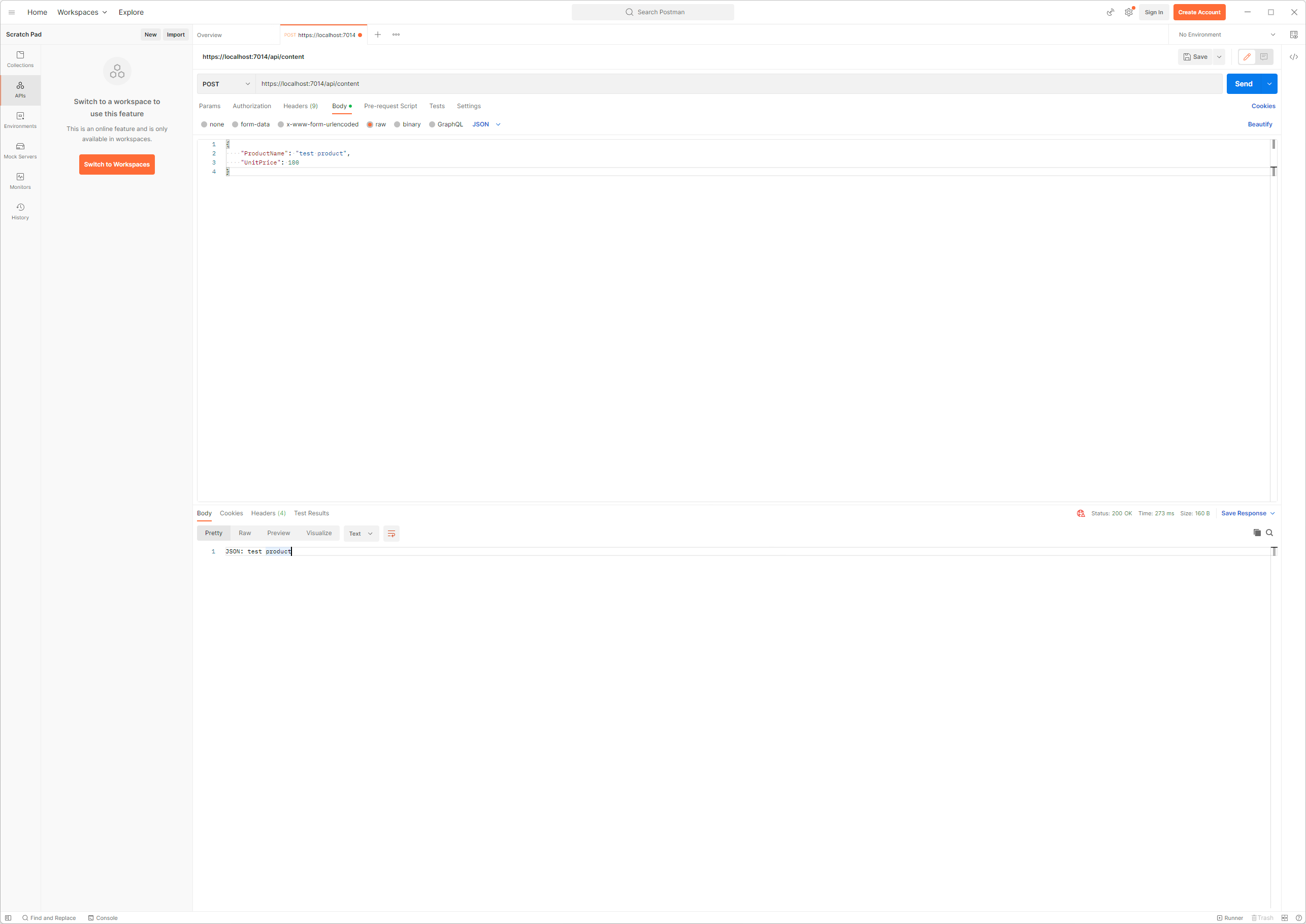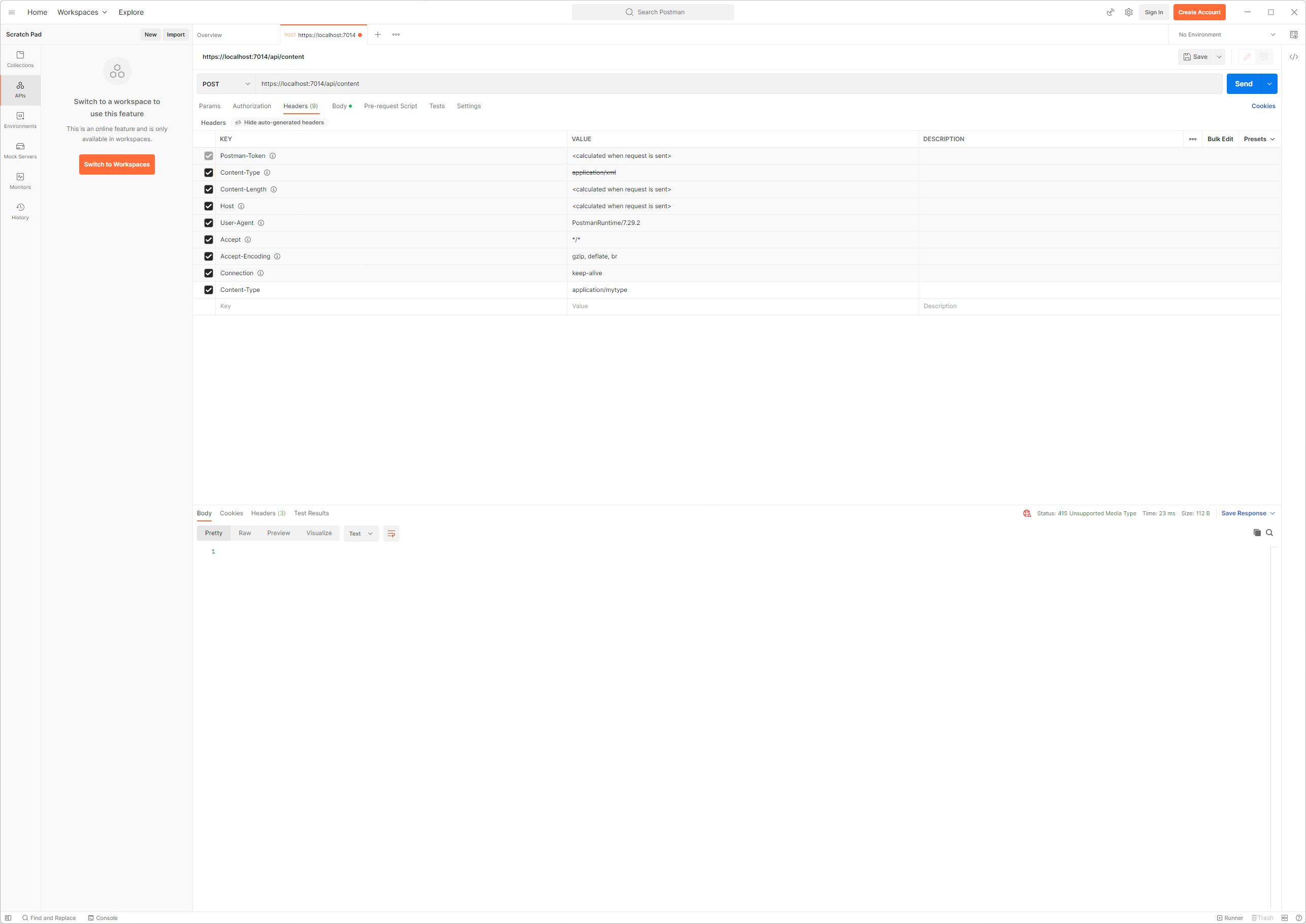 Project를 실행하고 POSTMAN에서 Content-Type을 'application/json'으로 설정하고 Method를 POST로 지정해 다음과 같이 api/content URL요청을 시도해 봅니다.