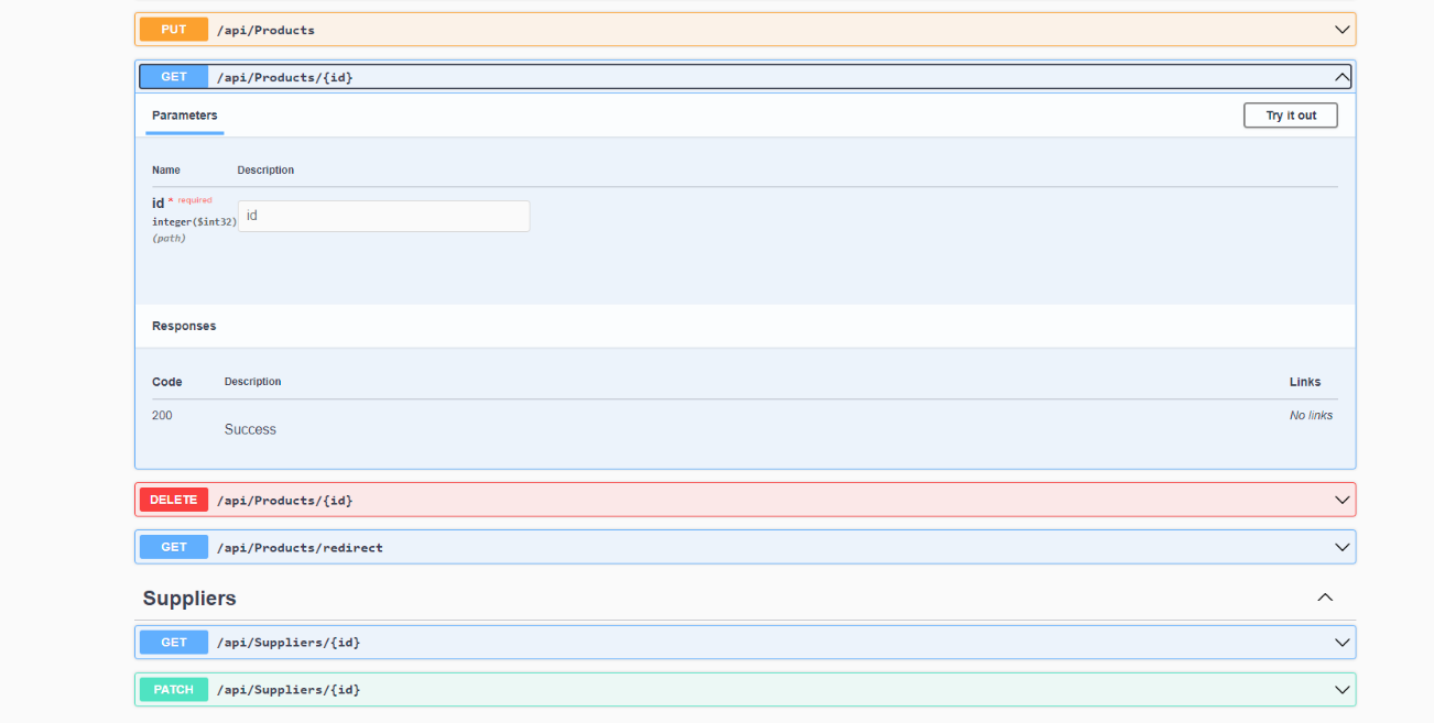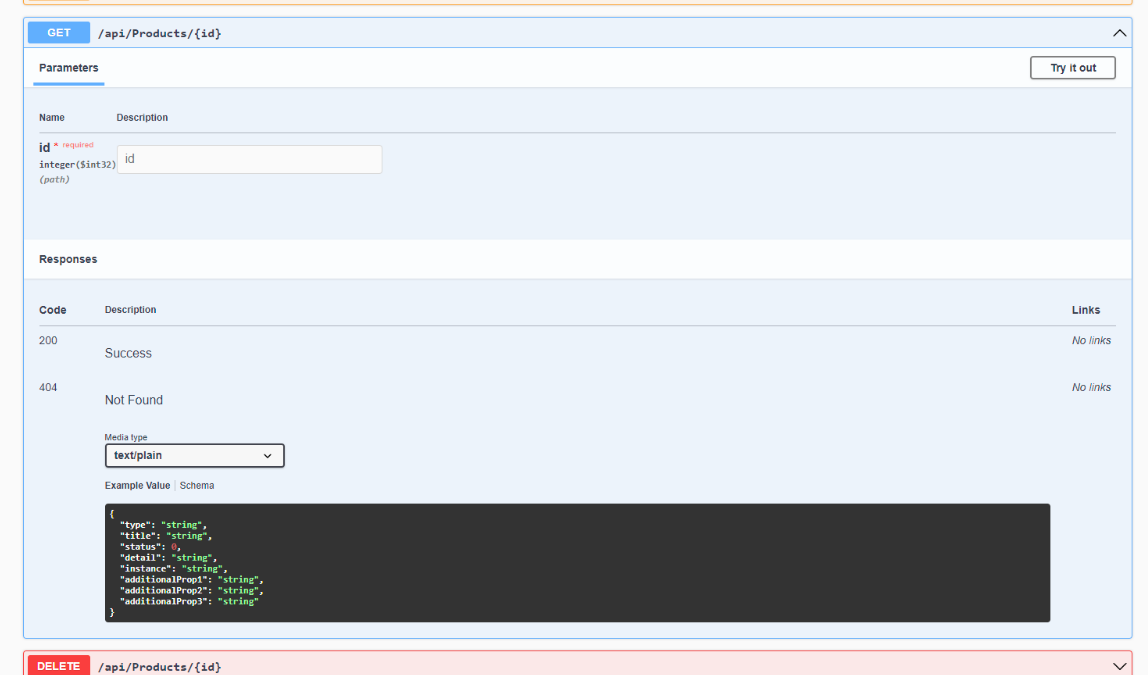 API discovery process에 대한 의존은 Web Service를 제대로 파악하지 못한 결과를 만들어 낼 수 있습니다. 이러한 예를 /api/products/{id} URL pattern의 GET 요청에 대해 서술하고 있는 Products section의 항목에서 확인해 볼 수 있습니다. 이 item을 확장하고 응답 section을 확인해 보면 명세서상으로는 단지 상태 code만 반환되고 있다는 것을 알 수 있습니다.