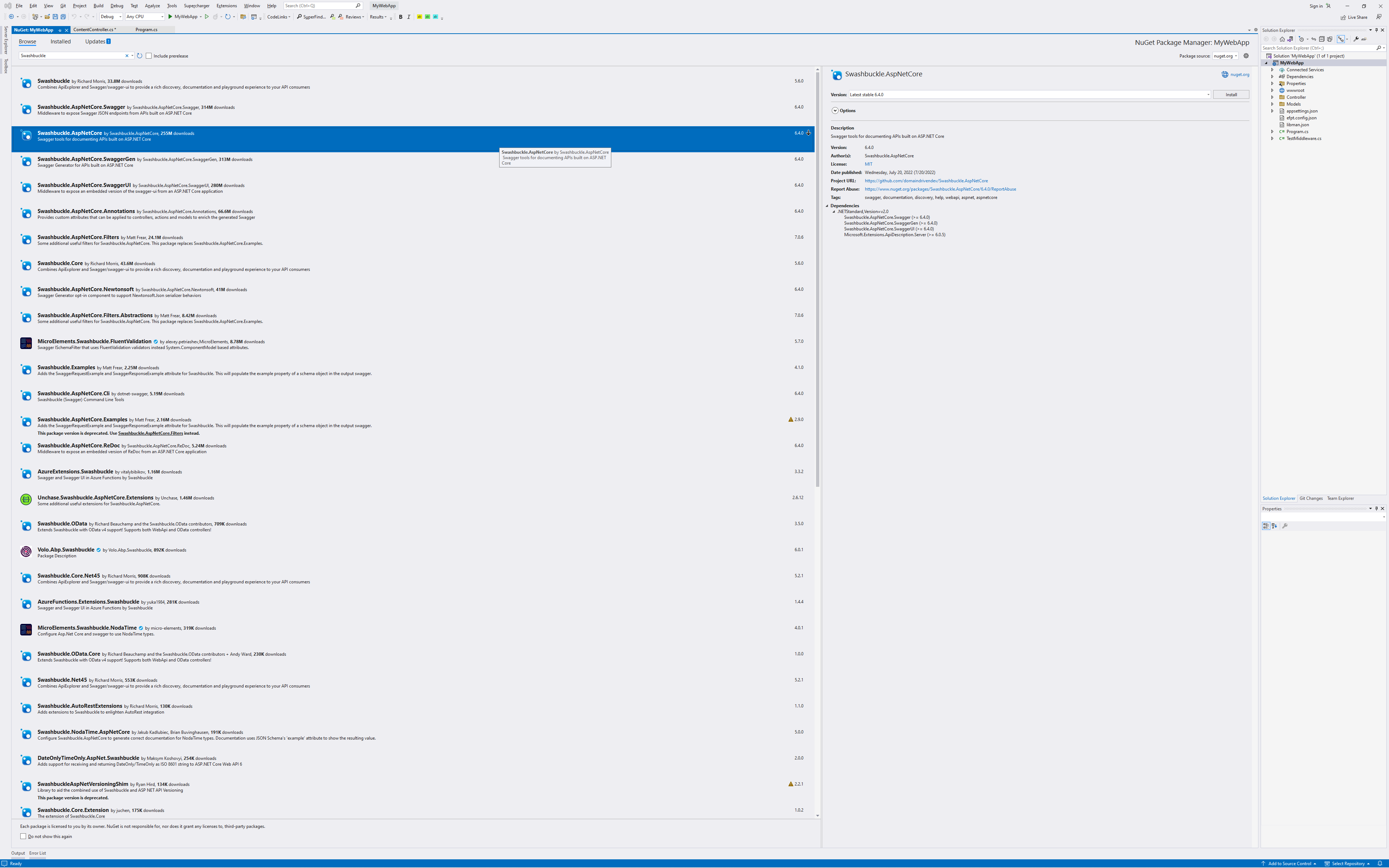 Package는 다음과 같이 NuGet Packages에서 'Swashbuckle.AspNetCore'을 검색해 설치할 수 있습니다.