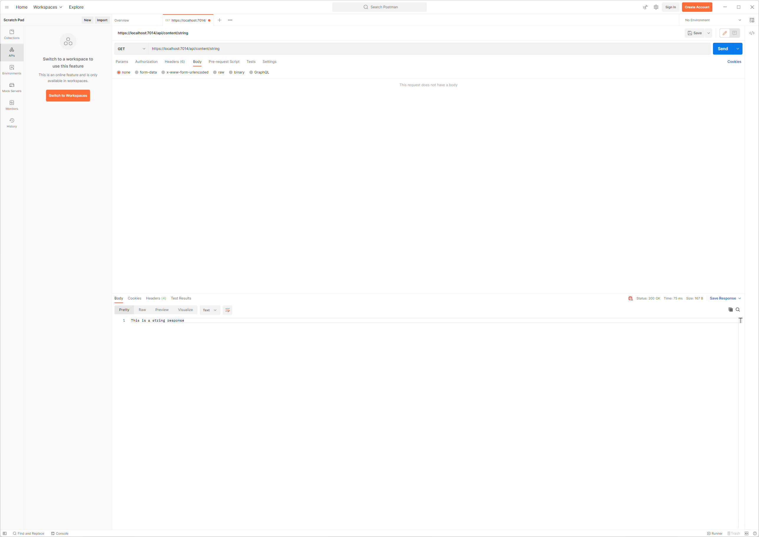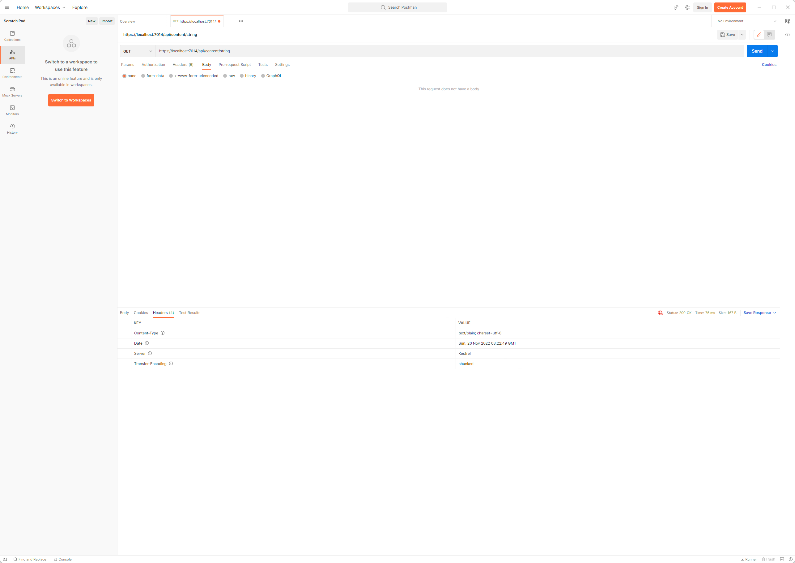 문자열의 경우 특별한 대우를 받는데 그 이유는 단순 문자열을 JSON으로 encode하게 되면 예상치 못한 문제를 유발할 수 있기 때문입니다. 다른 단순한 Type, 예를 들어 C#의 int형 값 2와 같은 것을 encode 하는 경우 응답은 문자열로 인용되어 "2"와 같은 결과를 응답하게 됩니다. 그런데 문자열을 encode 하게 되면 이중으로 문자열이 인용되어 "hello"는 결국 ""hello""와 같이 될 수 있습니다. 모든 client가 이중으로 encode 된 응답에 잘 대처할 수 있는 것은 아니므로 text/plain형식을 사용하고 이러한 문제를 해결하기보다는 그냥 피하는 것이 Application을 더 신뢰할 수 있도록 만들 수 있습니다. 물론 소수의 application에서만 단순한 string값을 보냄으로써 이러한 문제를 맞닥뜨리는 것은 흔하지 않고 대부분의 많은 곳에서는 JSON형식의 개체를 전송하곤 합니다. 기본 정책을 확인해 보기 위해 ContentController.cs file을 Project의 Controller folder에 아래와 같이 추가해줍니다.
