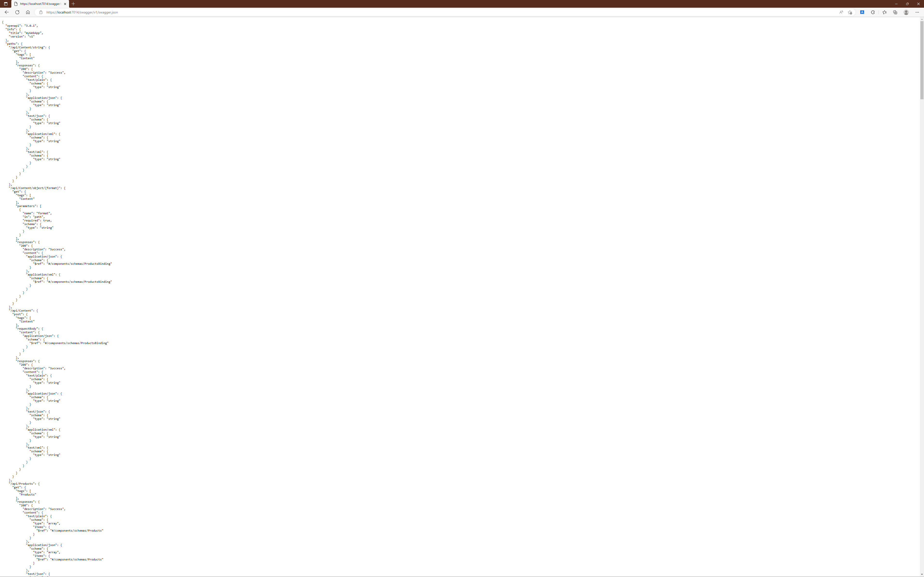 예제에서는 2개의 기능을 설정했는데 하나는 Application에 포함하고 있는 Web Service의 OPEN API 명세를 생성하는 것입니다. Project를 실행한 뒤 Web browser를 통해 /swagger/v1/swagger.json URL을 요청하면 실제 생성된 결과를 확인해 볼 수 있습니다.