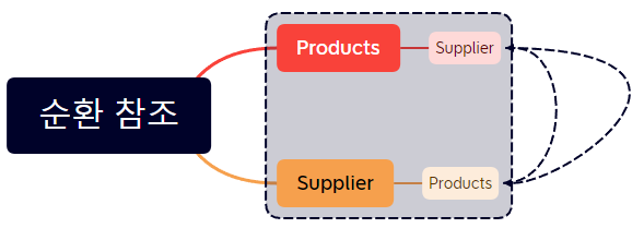 Entity Framework Core는 Supplier와 관련 Product개체를 Database에 질의하고 Suppliers.Products속성에 할당하도록 하고 있는데 문제는 Products와 Suppliers개체가 서로를 참조하는 방식으로 구조가 이루어 졌다는데 있습니다. Controller Action method에서 Suppliers개체를 반환할 때 JSON serializer가 개체의 속성을 통해 작동하면서 자연스럽게 Products개체 참조를 따르게 되고 이때 각각의 Products에서도 역시 Supplier개체를 참조하게 되면서 결국 서로 간에 순환 참조를 이루게 되는 것입니다.