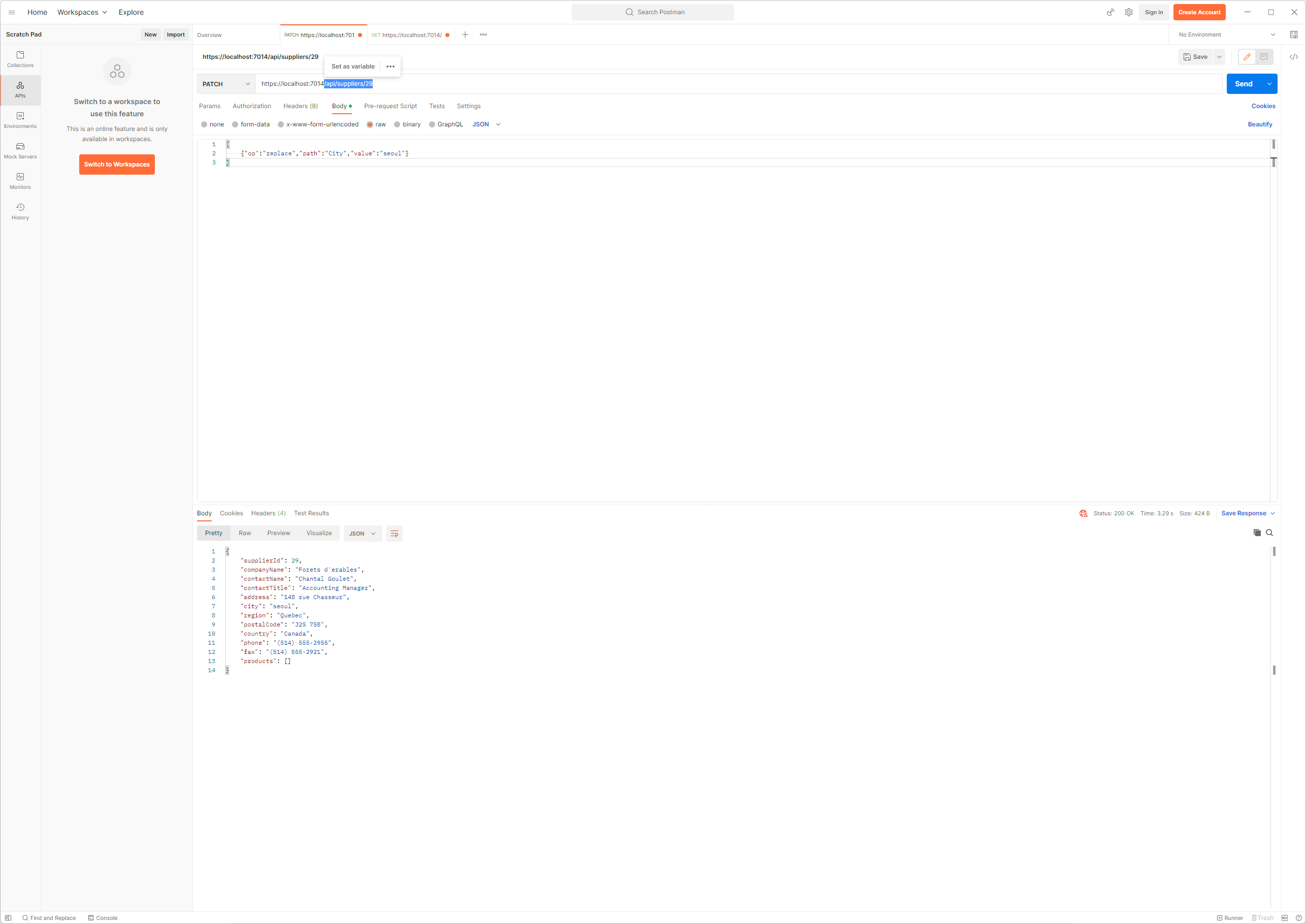 suppliers 개체와 함께 200OK응답이 돌아오면 다음과 같이 ID가 29인 suppliers개체의 city값이 바뀌어 있음을 확인할 수 있습니다.