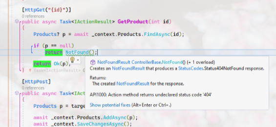 Project file에 위 구문을 추가하고 저장하게 되면 해당 위의 GetProduct action method의 NotFound()에는 다음과 같은 경고를 표시하게 됩니다.