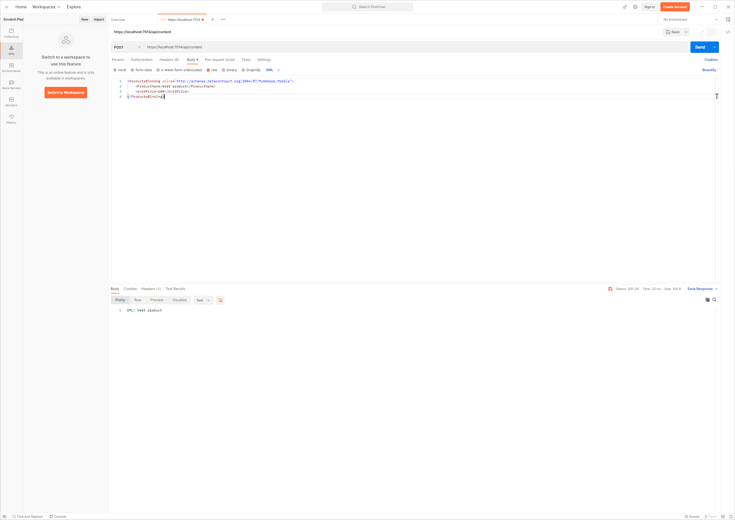 요청은 자동적으로 action method에 정확히 route 되어 설정한 형식으로 응답을 수행하게 됩니다. 이번에는 ContentType의 설정을 'application/xml'으로만 변경하고 POST method로 XML data를 아래와 같이 요청합니다.