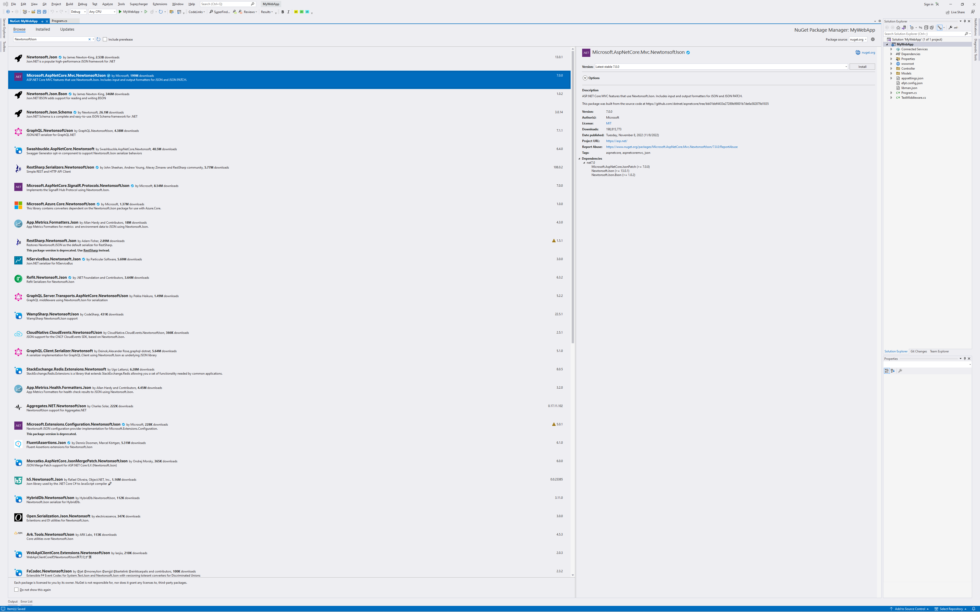 예제에서는 Microsoft.AspNetCore.Mvc.NewtonsoftJson version이 7.0으로 표시되어 있습니다. 글 작성 당시에는 .NET 7이 출시된 시기이며 Project가 .NET 7에 맞춰 생성된 것이라면 7.0을 설치해야 하지만 .NET 6.0이라면 Microsoft.AspNetCore.Mvc.NewtonsoftJson package도 6.0에 맞춰 설치해야 합니다.