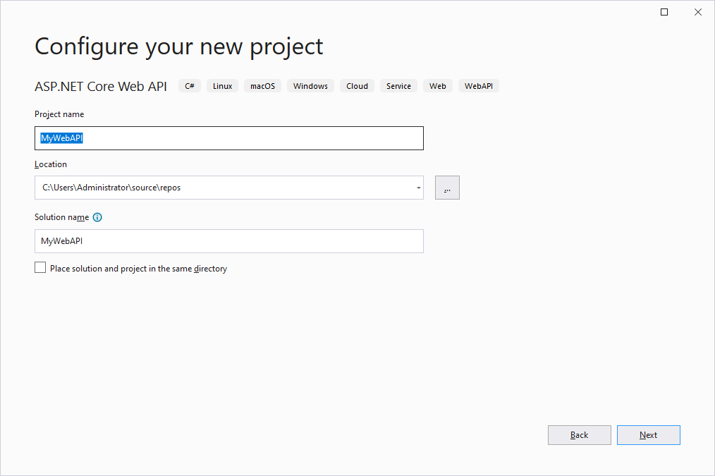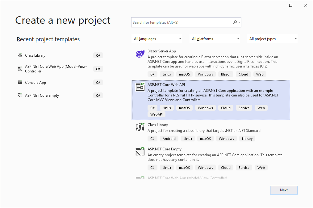 Visual Studio 2022를 실행해 File -> New -> Project를 선택하고 템플릿에서 'ASP.NET Core Web API'를 선택합니다.