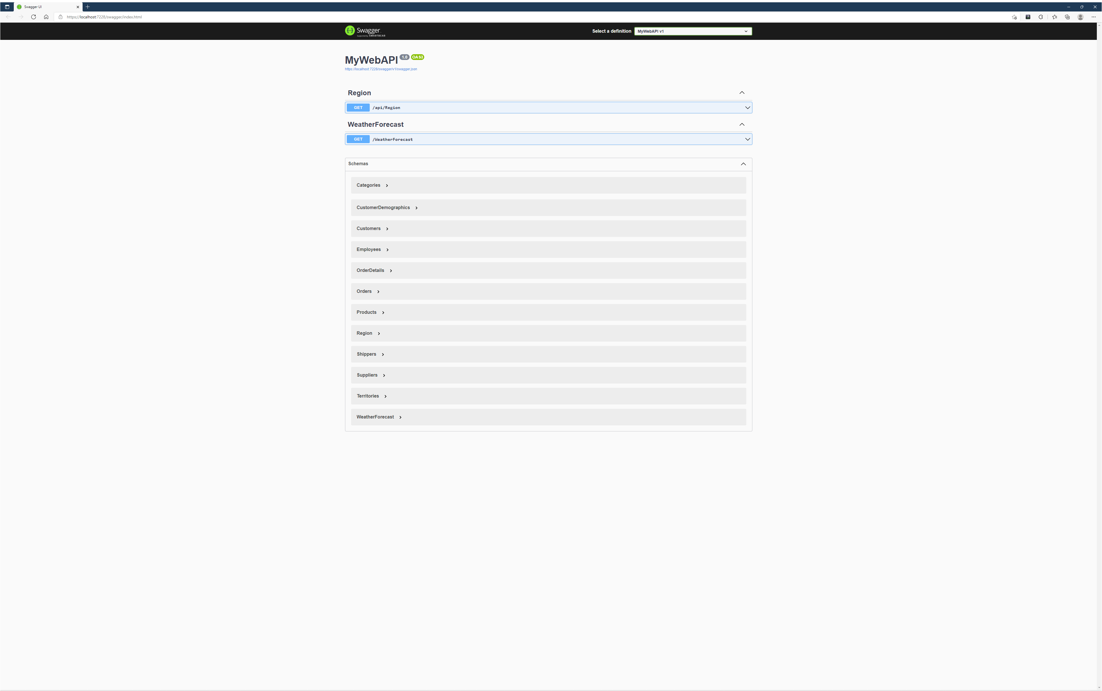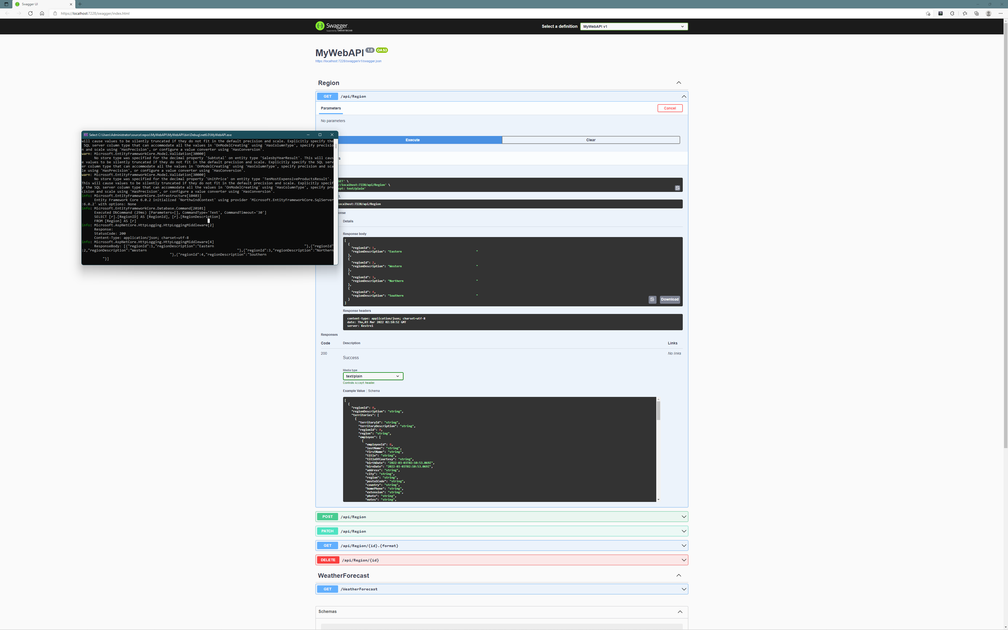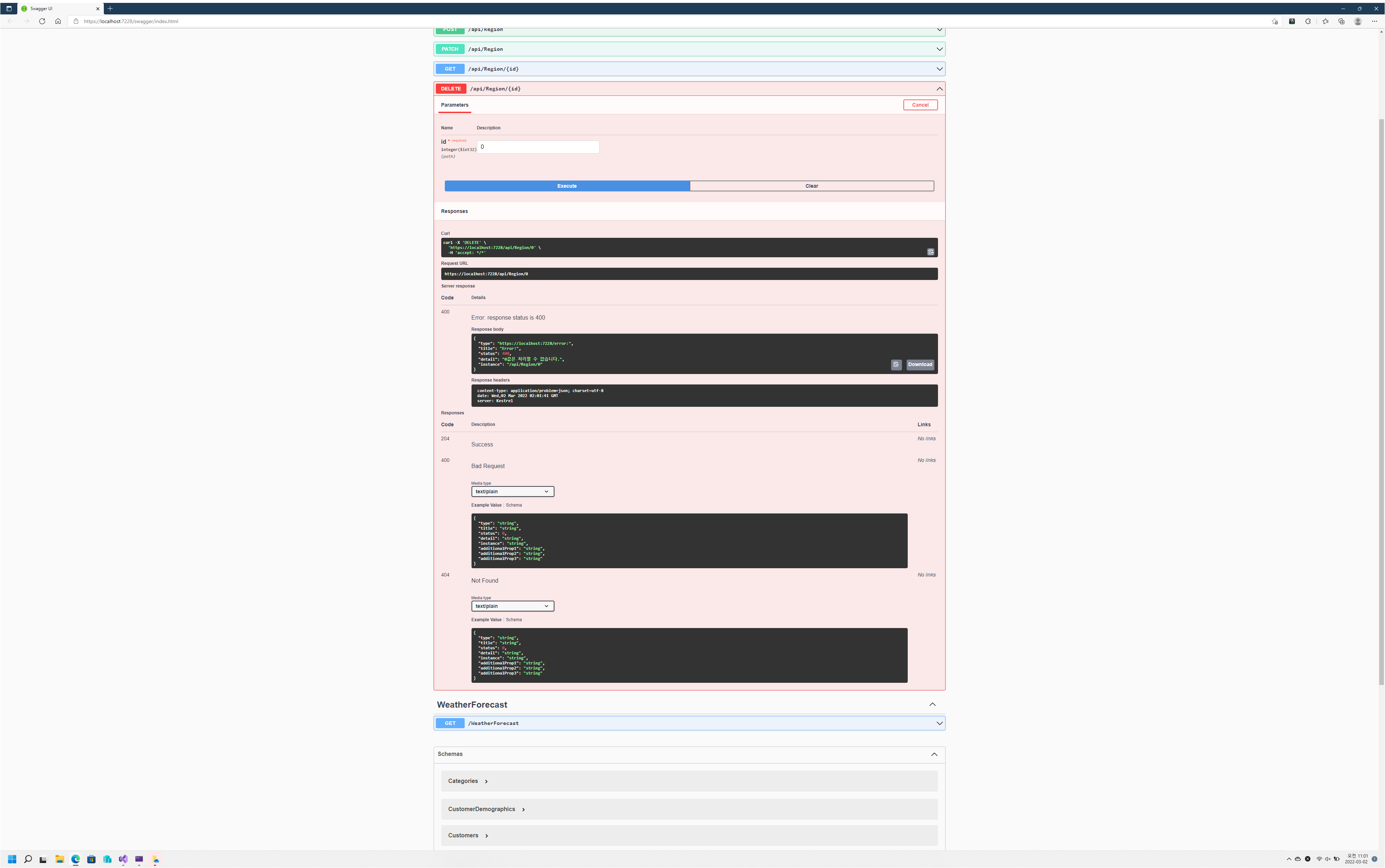 위 에제에서는 Get() 메서드를 추가한 뒤 추가한 URL을 확인하기 위해 프로젝트를 실행하고 임으로 /WeatherForecast로 이동해 특정 int값을 부여한 것입니다.