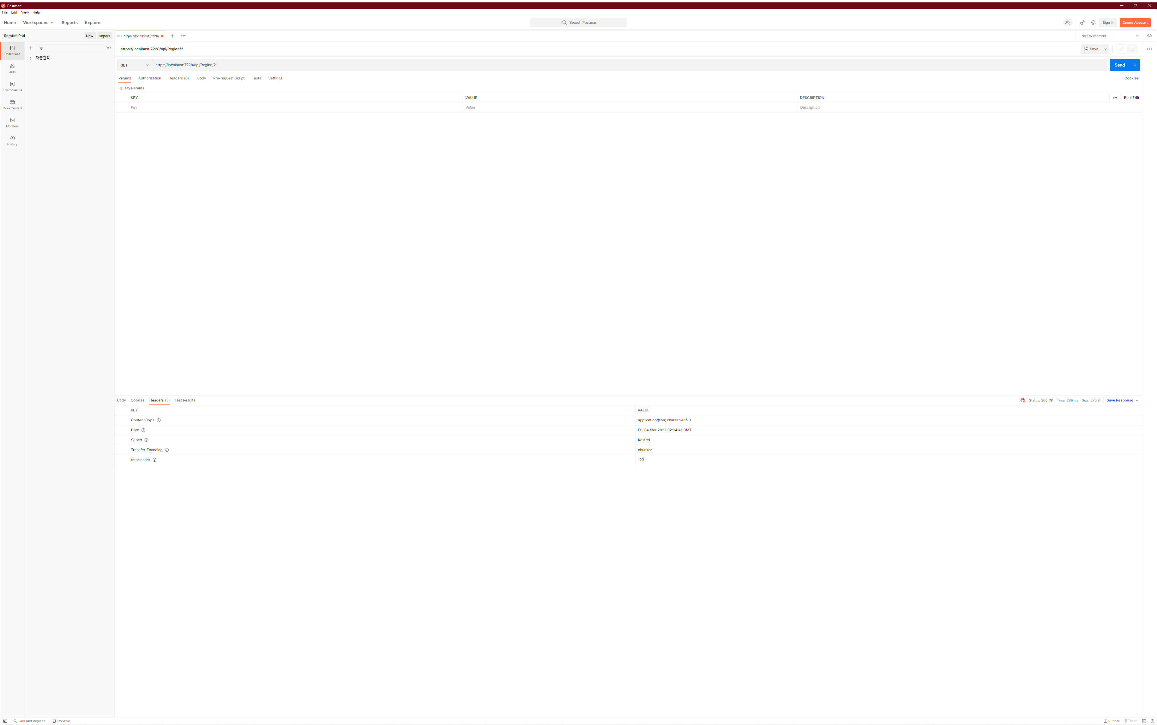 Invoke() 메서드에 필요한 헤더를 추가할 수 있으며 예제에서 헤더명은 tmpHeader로 값은 123으로 하였습니다.
