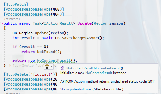 Oen API analyzer는 [ApiController]로 명시된 Controller Class에서 사용된 Method를 분석해 저절한 attribute가 decorate되어 있지 않으면 '경고'를 표시할 수 있도록 함으로서 API명세가 좀더 정확하게 작성될 수 있도록 유도해 줍니다.