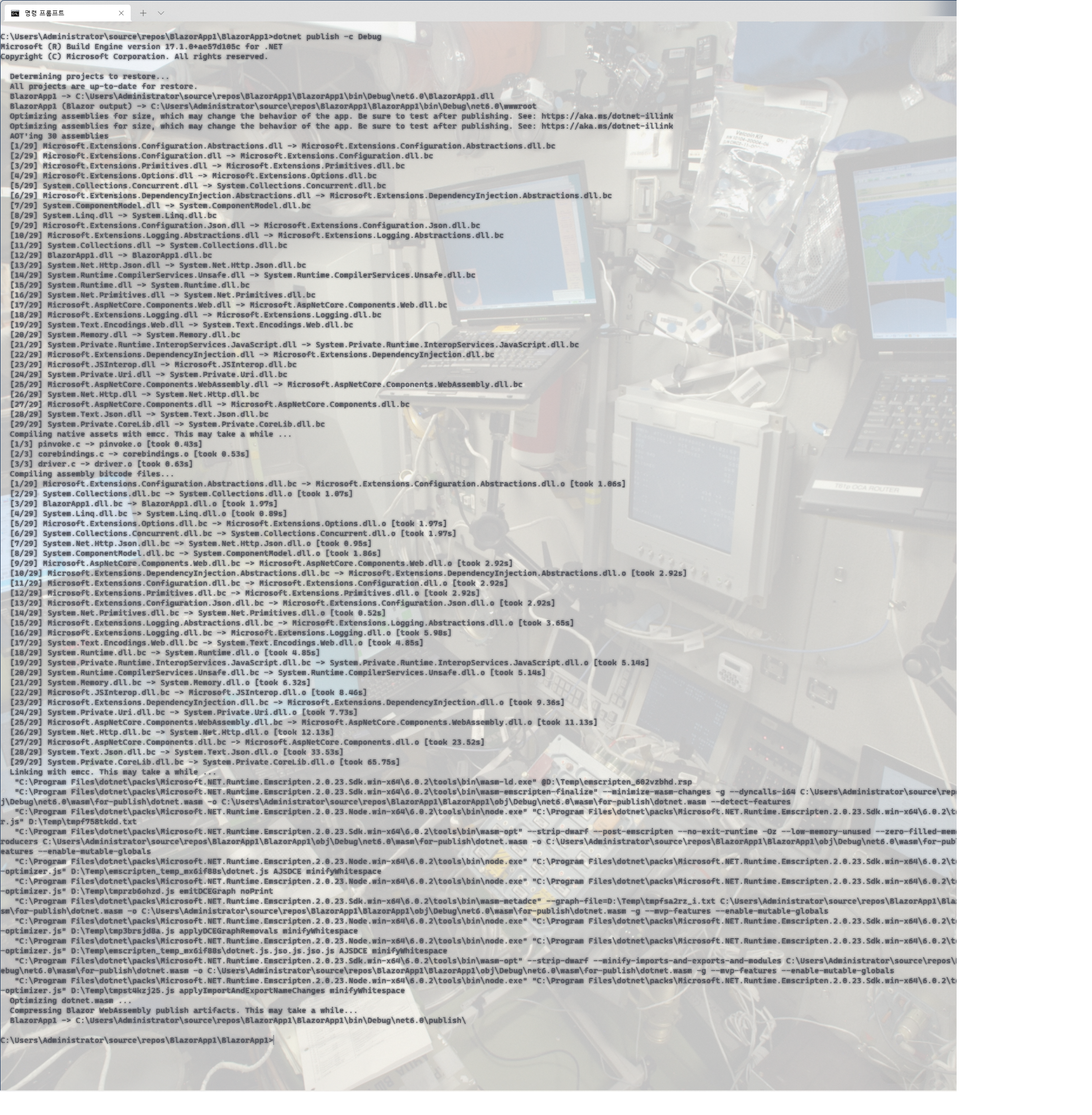 때문에 .NET6에서 마이크로소프트는 AOT(ahead of time)이라는 컴파일방식을 지원하기 시작했습니다. 다만 프로젝트의 규모에 따라 AOT 컴파일시간이 오래걸릴 수 있으므로 자동으로 수행되지는 않고 AOT 컴파일 사용을 명시해야 합니다.