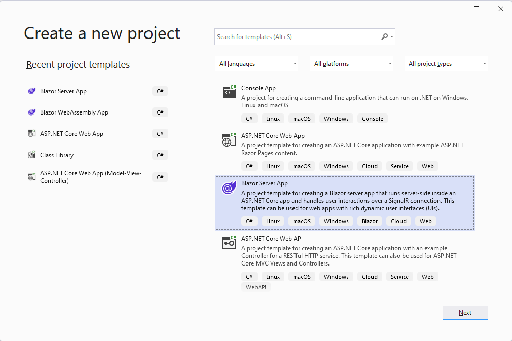 우선 Visual Studio 2022를 사용해 다음과 같이 기본 템프릿을 선택하는 방법으로 Blazor Server프로젝트를 생성합니다.