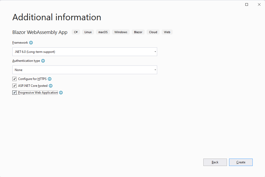 프로젝트는 ASP.NET Core의 일반적인 프로젝트를 생성하는 것과 거의 비슷합니다. 모든 선택사항에서 기본값을 그대로 두고 프로젝트명만 적절하게 지정하여 프로젝트를 생성하면 됩니다.